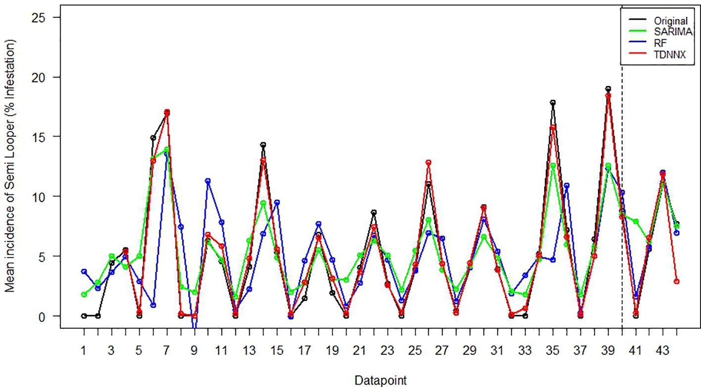 Figure 6. Plot of observed vs. fitted values of SARIMA, Random Forest, and TDNNX models for semilooper incidence.