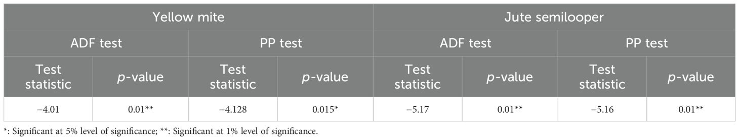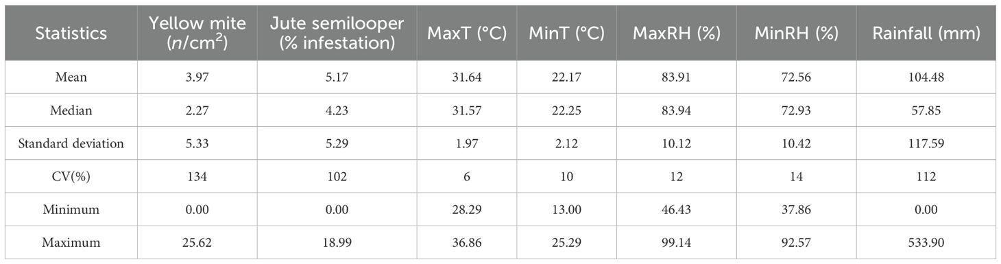 The incidence data of major jute pests used in this study are secondary data obtained from the All India Network Project (AINP) on Jute and Allied Fibers, Uttar Banga Krishi Viswavidyalaya (UBKV) Centre, Pundibari, Cooch Behar, West Bengal, covering the period from 2013 to 2023. During each crop season, yellow mite and jute semilooper incidences are available at 25, 35, 45, 55, 65, and 75 days after sowing (DAS). The infestation level of the semilooper is measured as the percentage of infestation, while yellow mite incidence is quantified by counting its number per square centimeter on the second unfold leaf. The pest incidence data used in this study were collected from control fields, i.e., without pest control operations, from a widely cultivated variety of jute, JRO-524 recommended for the region. The same variety was consistently used across all years of the study (2013–2023) to maintain uniformity in pest incidence data collection and avoid variability arising from genetic differences among varieties. It was consistently observed across all years that pest incidence at 25 and 75 DAS was zero. Including these zero values in the analysis could lead to inconsistencies in model fitting and forecasting. Moreover, the study focuses primarily on pest incidences that exceed the economic threshold levels—approximately five mites per square centimeter for yellow mite and 10% infestation for jute semilooper, as reported in the literature. Therefore, data from 25 and 75 DAS were excluded, and the analysis was conducted using the remaining data points where significant pest incidence was observed. Similarly, the weather data used in this study are secondary data obtained from the records of Gramin Krishi Mausam Sewa (GKMS), Agrometeorological Field Unit (AMFU), Pundibari, UBKV. The dataset includes daily observations of rainfall (mm), maximum and minimum temperatures (MaxT and MinT in °C), and maximum and minimum relative humidity (MaxRH and MinRH in %) spanning the period from 2013 to 2023. These daily records were aggregated into weekly data based on the Standard Meteorological Weeks (SMWs) to correspond with the pest incidence survey dates. For each SMW, the rainfall values were summed, while the temperature and relative humidity variables were averaged to ensure consistency with the timing of pest observations.