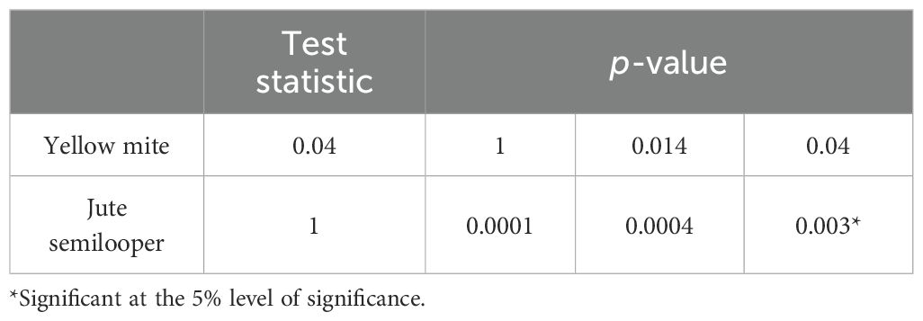 Table 15. Out-of-sample forecast for the mean incidence of yellow mite and jute semilooper for the year 2024 using average weather data from 2013 to 2023.