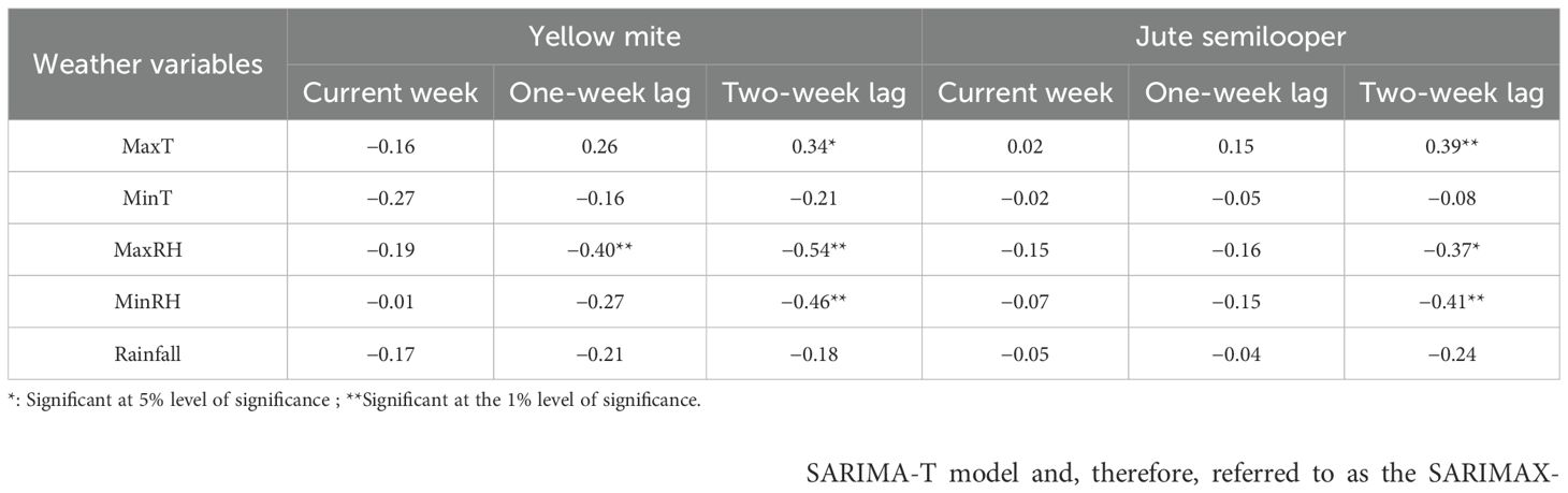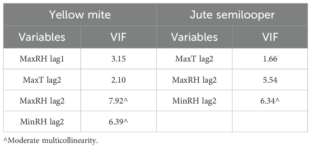 Results of Pearson’s correlation analysis in Table 3 reveal that the mean incidence of yellow mite is significantly positively correlated with maximum temperature at a 2-week lag, whereas it is significantly negatively correlated with maximum RH at a 1-week lag, and minimum and maximum RH at a 2-week lag. Similarly, the mean incidence of jute semilooper is also significantly positively correlated with maximum temperature at a 2-week lag, whereas it is significantly negatively correlated with maximum and minimum RH at a 2-week lag. The weather variables that are significantly correlated with pest incidence are further subjected to multicollinearity analysis. The results of multicollinearity analysis in Table 4 reveal that maximum and minimum RH at a 2-week lag show moderate multicollinearity for yellow mite incidence, whereas for jute semilooper, minimum RH at a 2-week lag shows moderate multicollinearity. Therefore, maximum RH at a 1-week lag and maximum temperature at a 2-week lag are to be used as exogenous variables in time series models for yellow mite incidence, whereas for jute semilooper, the exogenous variables are maximum temperature and maximum RH at a 2-week lag.