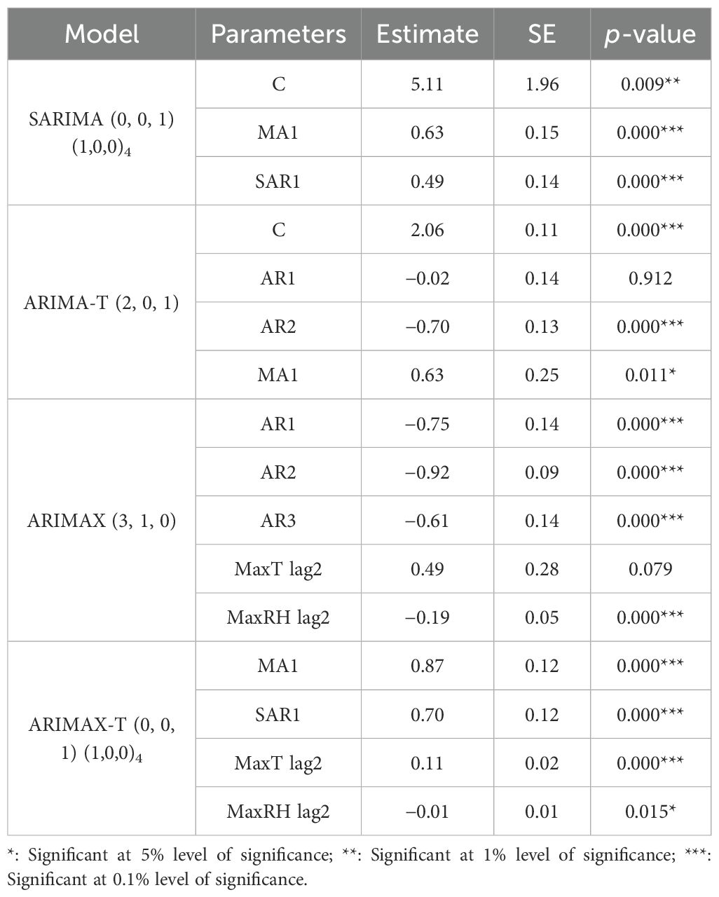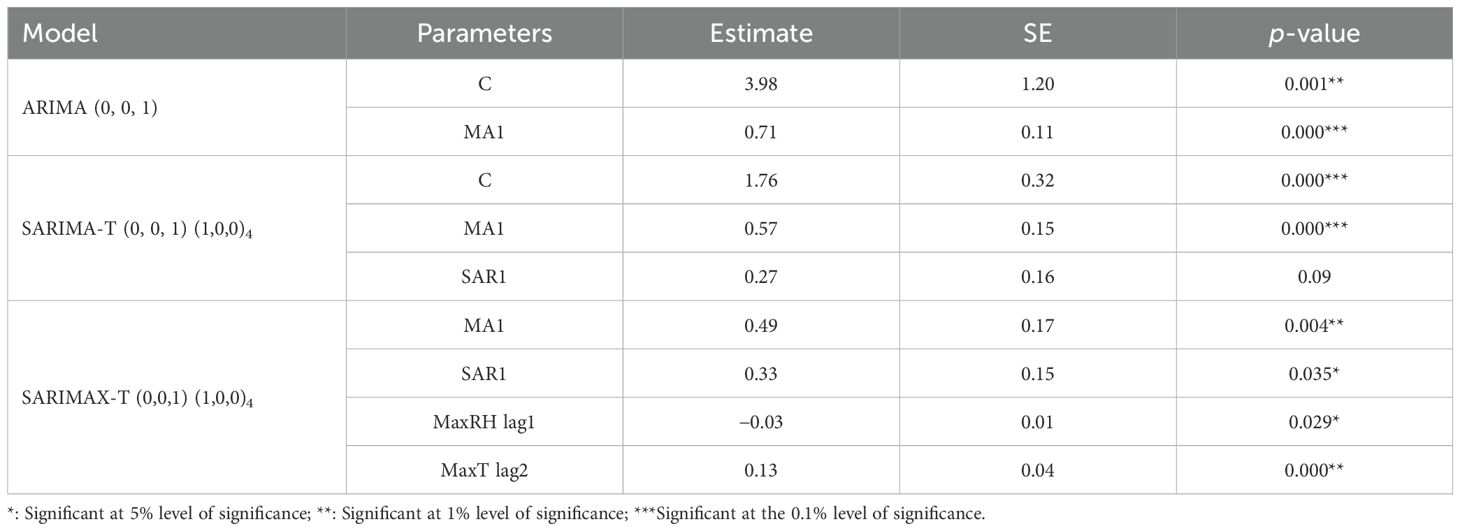Table 6. Parameter estimates of the ARIMA (0, 0, 1), SARIMA-T (0, 0, 1) (1,0,0)4, and SARIMAX-T (0,0,1) (1,0,0)4 models for yellow mite incidence.