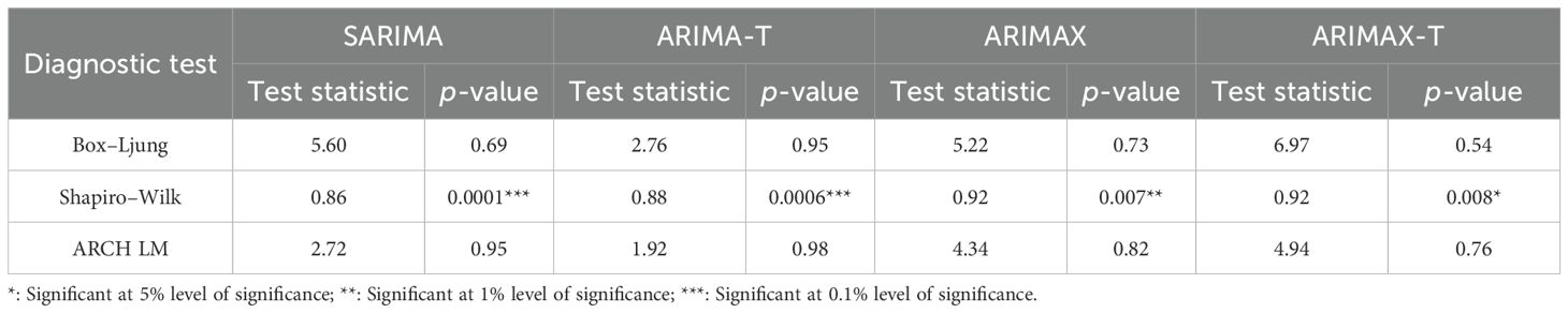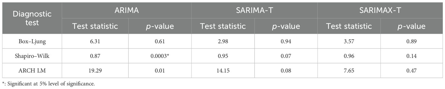 After confirming the stationarity of the time series data of yellow mite incidence, an ARIMA model is fitted and the parameters are presented in Table 6. The residuals of the fitted ARIMA model are found to be non-normal, as evident from Table 7; therefore, the original data series is transformed using square root transformation with the addition of 0.5 as few zero values are there. The transformed data exhibit seasonality as evident from the WO test, and therefore, a suitable SARIMA model is fitted based on the minimum AIC and BIC criteria, and this model is referred to as SARIMA-T. The parameters of the fitted SARIMA-T model are also presented in Table 6. Subsequently, MaxRH at 1 week and MaxT at 2 weeks are used as exogenous variables in the SARIMA-T model and, therefore, referred to as the SARIMAX-T model.