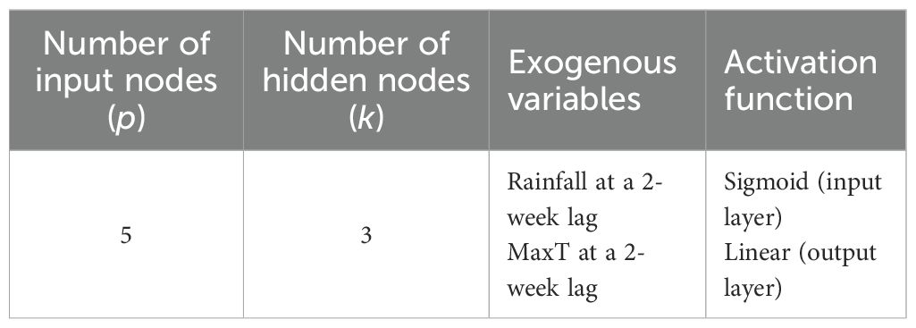 The TDNNX model is fitted between the mean incidence of pest with its lagged values up to the significant order and exogenous weather variables selected from the Random Forest model. In the TDNNX (p,k) model, p and k indicate the number of nodes in the input and hidden layer, respectively. For both yellow mite and semilooper incidences, there are five nodes in the input layer that correspond to lagged values of mean pest incidence up to the order of three and two exogenous weather variables. The hyperparameters of the fitted TDNNX model are presented in Table 12.