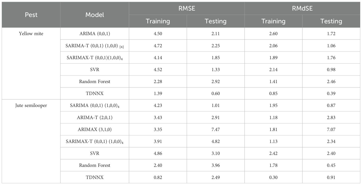 To check the presence of seasonality in pest incidence, time plots of the mean incidence of both pests are constructed along with the Webel–Ollech (WO) seasonality test. Pest weather relationship has been studied using the Pearson correlation coefficient between mean pest incidence and weather variables in the current week as well as at the 1- to 2-week lag. Various time series forecasting models, including Autoregressive Integrated Moving Average (ARIMA), ARIMA with exogenous variables (ARIMAX), Seasonal ARIMA (SARIMA), and SARIMA with exogenous variables (SARIMAX), are implemented. In addition, machine learning models such as Random Forest, Support Vector Regression (SVR), and Time Delay Neural Network with exogenous variables (TDNNX) are used to predict the mean pest incidence based on weather variables. A total of 44 data points from 2013 to 2023 are available, out of which the initial 40 data points (2013–2022) were used for model development and the remaining 4 data points from 2023 were reserved for model validation, maintaining a 90:10 train–test ratio. The analysis has been carried out using R software.