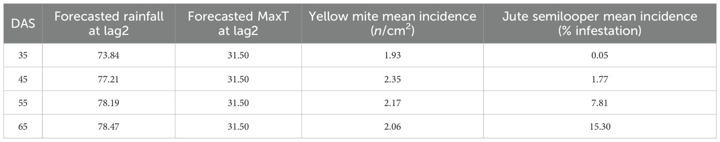 The out-of-sample forecasts for pest incidence of yellow mite and jute semilooper are obtained using the TDNNX model for the year 2024 at 35, 45, 55, and 65 DAS. The forecasts are obtained using forecasted values of weather variables, i.e., rainfall and MaxT at a 2-week lag, from the ARIMA model, and the results are presented in Table 14. Additionally, out-of-sample forecasts of pest incidence are also made using the average values of weather variables (rainfall and MaxT at a 2-week lag) for the period from 2013 to 2023, and the results are presented in Table 15.