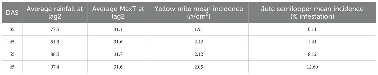 The study found that the peak mean incidence of jute semilooper and yellow mite occurs at 45 and 55 DAS, respectively, with seasonality observed only in jute semilooper. Among the crop years studied, the peak mean incidence of yellow mite was recorded in 2014, while for jute semilooper, it occurred in 2022. The study also revealed that incidence of yellow mite has a significant positive correlation with maximum temperature at a 2-week lag while the correlation with maximum relative humidity at a 1- and 2-week lag is highly significant in a negative direction. This suggests that dry weather with high temperatures 2 weeks prior leads to higher yellow mite infestations at present. Consequently, if such weather conditions are observed, there is a likelihood of increased mite infestation in the following 2 weeks. This information can assist farmers in better preparing for pest emergence and in making informed decisions regarding pest control measures. Among the different time series and machine learning models, the TDNNX model was found to be the most accurate for predicting the mean incidence of both yellow mite and jute semilooper using weather variables.