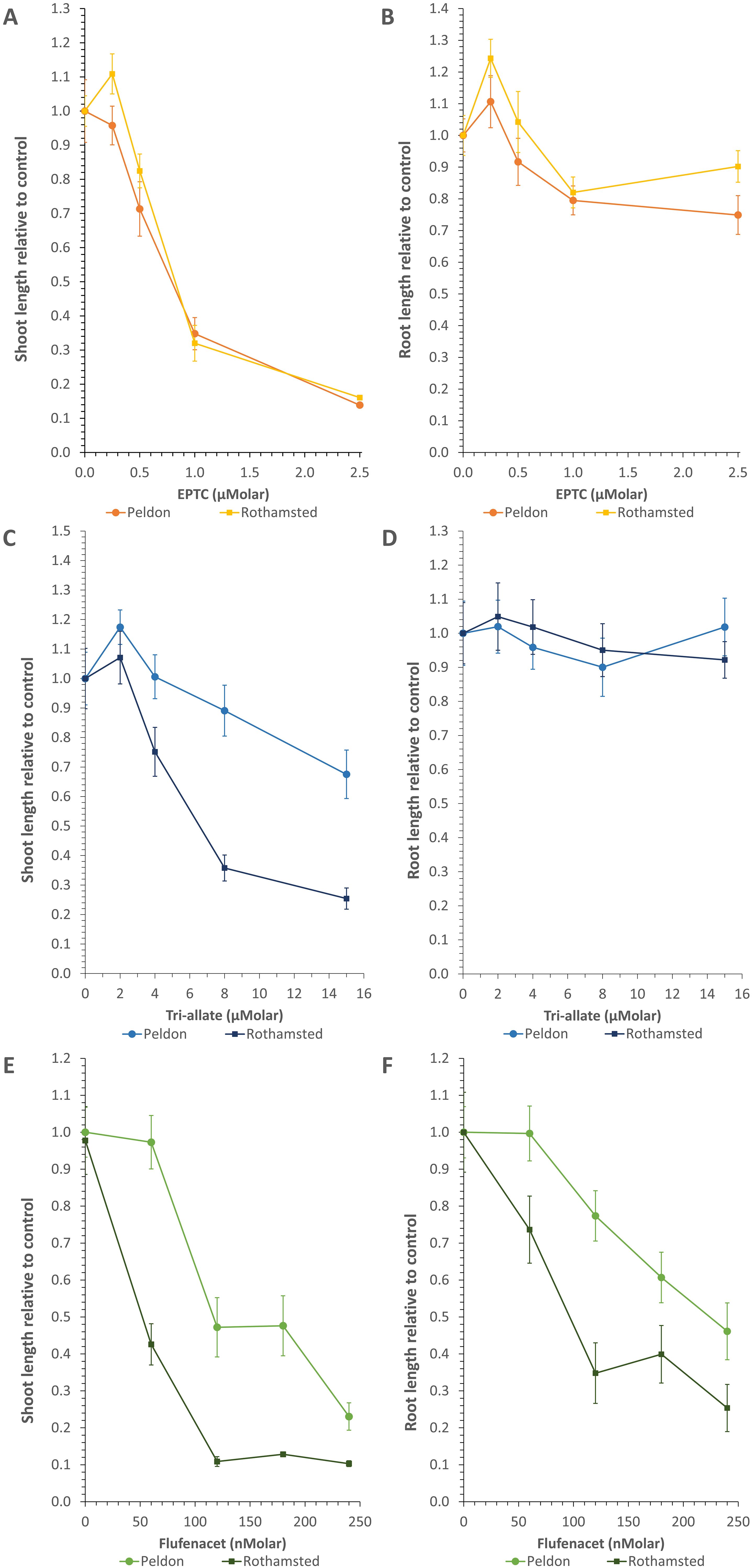 Figure 1. Example curves illustrating the different effects of the pre-emergent herbicides on the two blackgrass biotypes on shoots and roots. Average lengths relative to the biotype control ± standard error for (A, B) EPTC; (C, D) tri-allate; and (E, F) flufenacet. Statistical analyses for these data are presented in Supplementary Tables 1, 2.