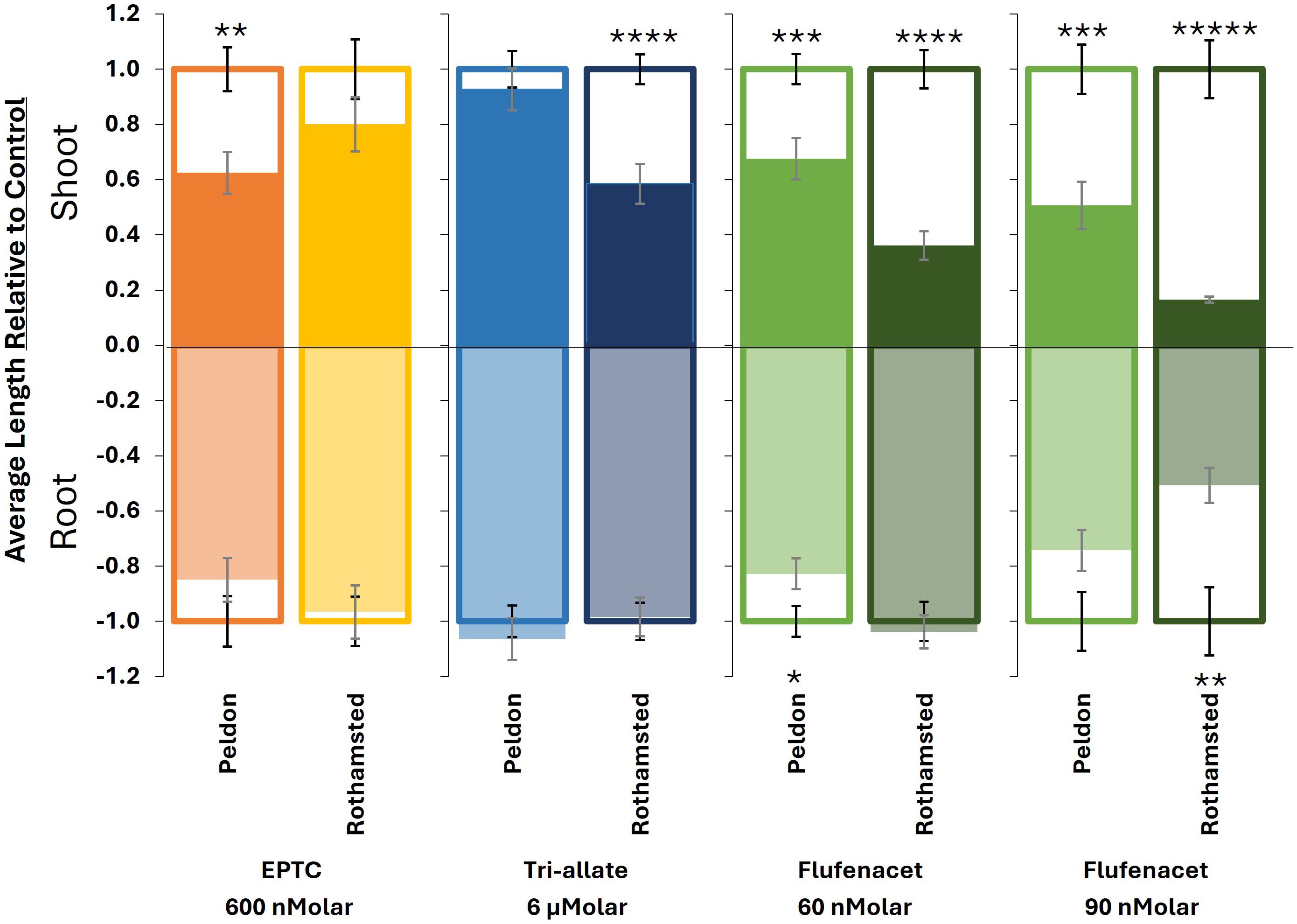 Figure 2. Bar plots of the average length of shoots (up) and roots (down) relative to the untreated controls for each Blackgrass biotype and herbicide single-dose treatment. The outlines represent the control, while the fill represents the response to herbicide treatment at the selected respective dose: EPTC (600 nMolar), tri-allate (6 μM) and flufenacet (60 nM and 90 nMolar). Where the fill (herbicide) extends past the outline (control), the herbicide-treated samples are larger than the control. Error bars represent standard error. Significance codes results of paired t-tests comparing control to the herbicide-treated samples of the same biotype, *P ≤ 0.05, **P ≤ 0.01, ***P ≤ 0.001, ****P ≤ 0.0001, *****P ≤ 0.00001.