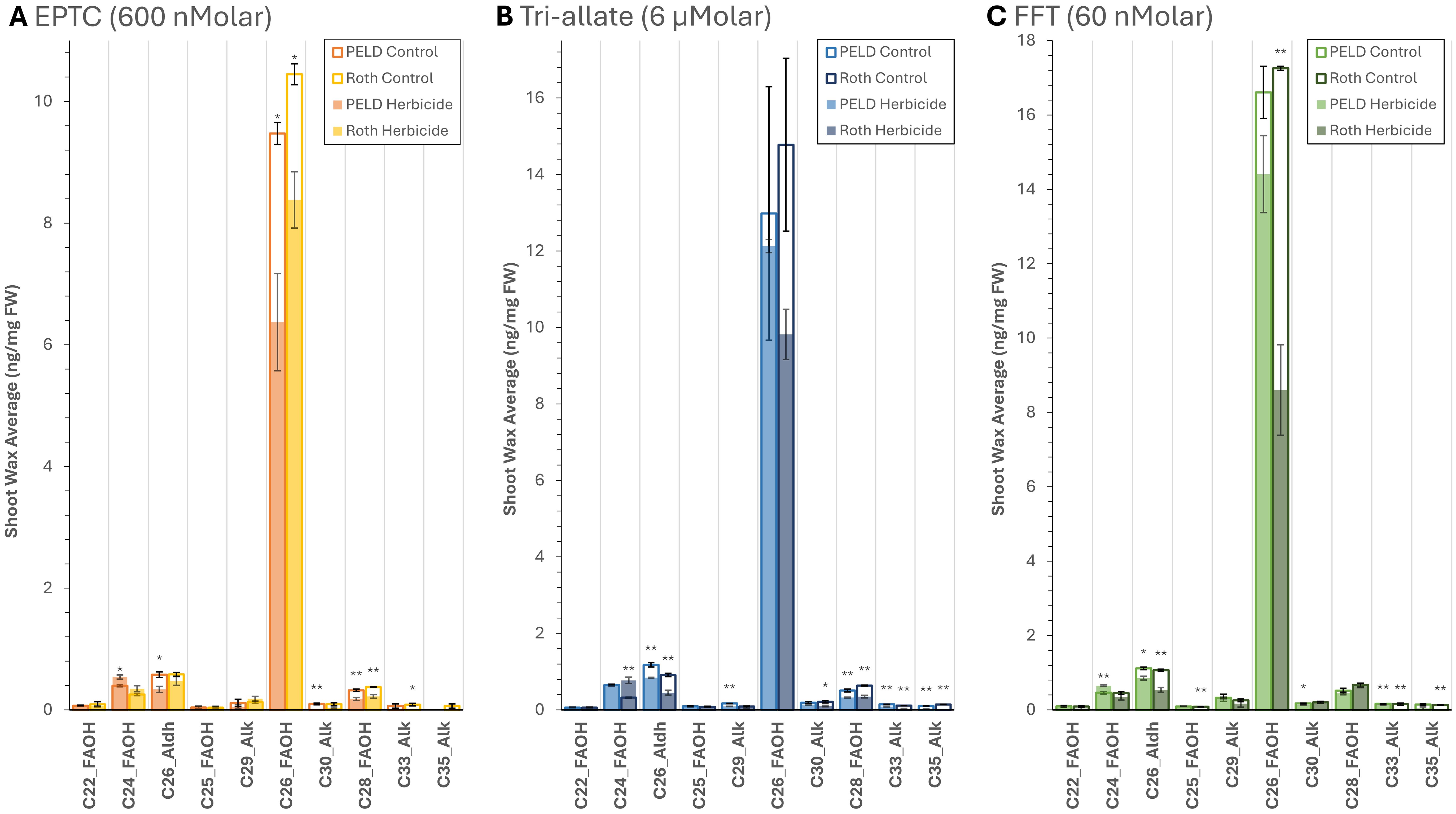 Figure 3. Rothamsted and Peldon shoot wax average composition ng/mg FW sample with and without herbicide treatment with (A) EPTC, (B) Tri-allate and (C) flufenacet (FFT). Analysis of data generated through GC-FID. The outlines represent the control, while the fill represents the response to herbicide treatment, n=3. *P ≤ 0.05 and **P ≤ 0.01 by Student’s T-tests with a two-tailed distribution and two-sample homoscedastic variance. Peld, blackgrass biotype Pedon; Roth, blackgrass biotype Rothamsted.
