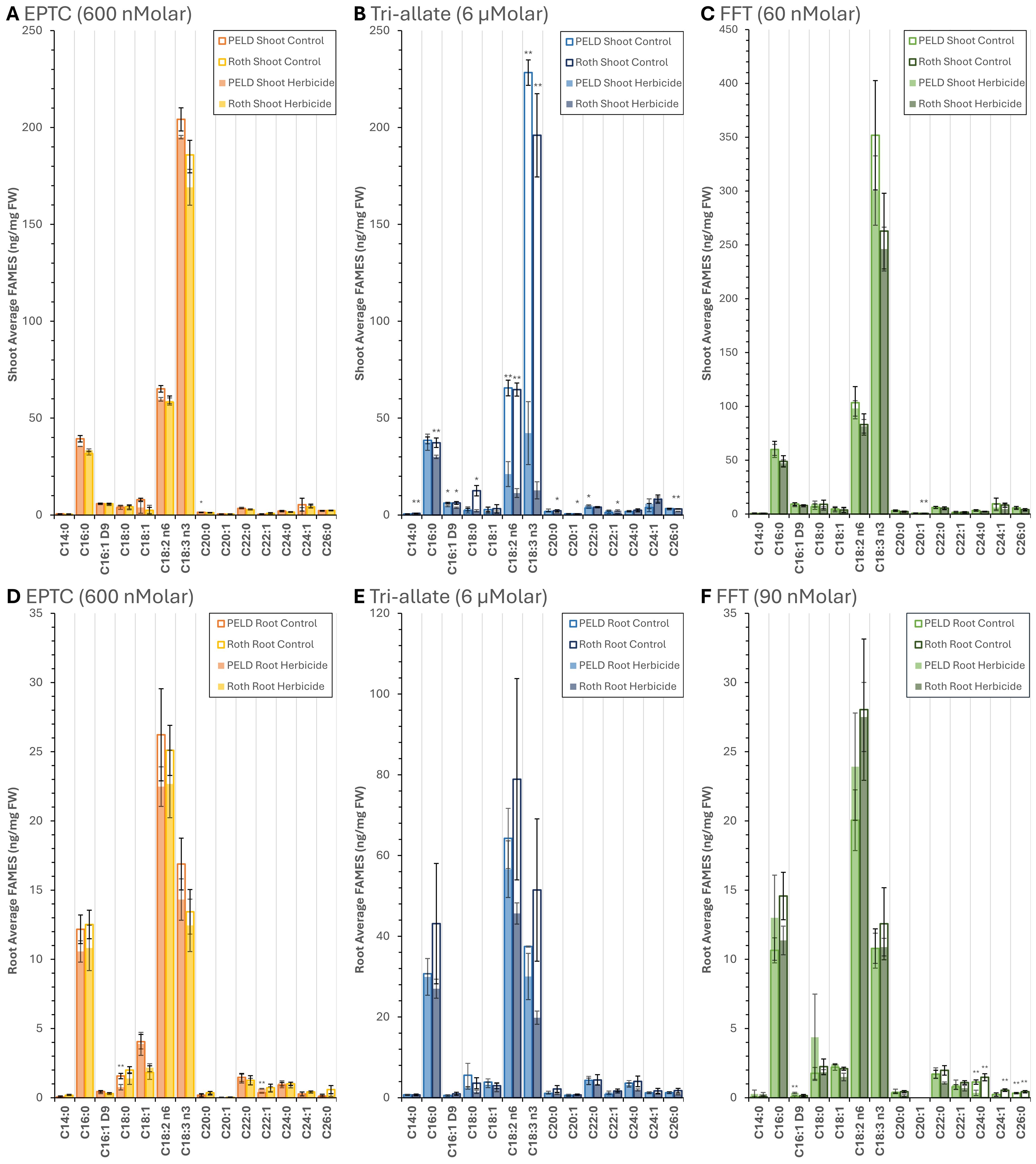 Figure 4. Quantified differential accumulation of fames in blackgrass shoot and root following herbicide treatment (A-D) EPTC, (B-E) Tri-allate, and (C-F) flufenacet (FFT). Analyzed using GC-FID. Control samples not treated with herbicide are included for baseline comparison. Each data point represents the mean of three biological replicates, except for in (A) Peldon Herbicide treated and (E) Tri-allate Control, where n=2, with error bars indicating a standard error. *P ≤ 0.05 and **P ≤ 0.01 by Student’s T-tests with a two-tailed distribution and two-sample homoscedastic variance. Peld, blackgrass biotype Pedon; Roth, blackgrass biotype Rothamsted.