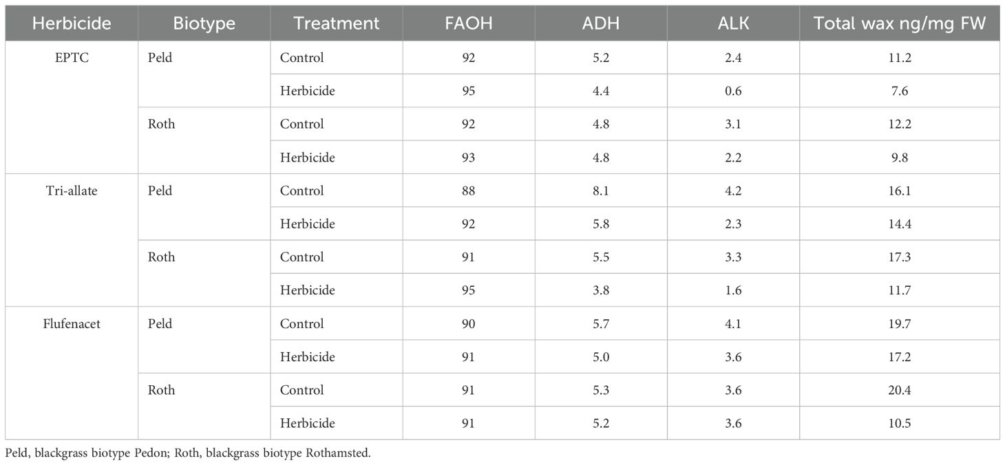 Table 1. Percentage mass composition of fatty alcohols (FAOH), aldehydes (ADH), and alkanes (ALK) in the total shoot wax content of two blackgrass biotypes.