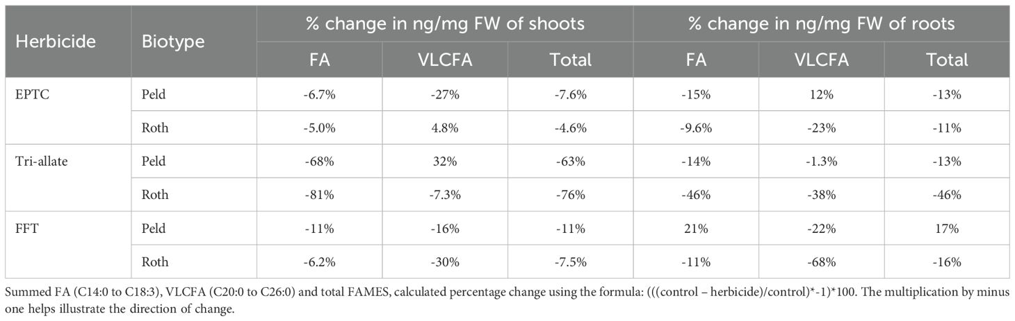 Tri-allate produced the largest and most consistent changes in fatty acid composition. In the FAMES analysis, tri-allate reduced total fatty acids in shoots by 63% (Peldon) and 76% (Rothamsted) (Table 2). The most significant changes were in the C18 polyunsaturated fatty acids linoleic (C18:2Δ9,12 n6) and α-linolenic (C18:3Δ9,12,15 n3) which were reduced by 68–94% across biotypes (Figure 4; Supplementary Tables 5,6). Treatment with tri-allate also significantly decreased palmitoleic acid (C16:1Δ9), palmitic acid (C16:0), and myristic acid (C14:0) in Rothamsted shoots by 39%, 20%, and 58% respectively (Figure 4; Supplementary Figure 3; Supplementary Tables 5, 6). In roots, tri-allate produced smaller but measurable decreases in total FAs (-13% in Peldon; -46% in Rothamsted) and only minor changes in VLCFAs in Peldon (-1%) but strong changes in Rothamsted (-38%) (Table 2; Supplementary Tables 7, 8). By contrast, EPTC had far smaller effects on C14–C22 species which was not statistically significant in most comparisons (Figure 4; Supplementary Figure 3; Supplementary Tables 5-8). For all species measured by FAMES, EPTC led to moderate percent changes with total changes of -7.6% and -13% in Peldon shoots and roots respectively and -4.6% and -11% in Rothamsted shoots and roots respectively (Table 2). The saturated and monounsaturated VLCFAs were decreased in Rothamsted by flufenacet treatment; shoots by -30% and roots by -68% (Table 2) with species of chain lengths of C24 or longer (C24+) significantly reduced in roots (Figure 4; Supplementary Table 7). Therefore marked differences were observed between biotypes and herbicides with regard to VLCFA content and composition.