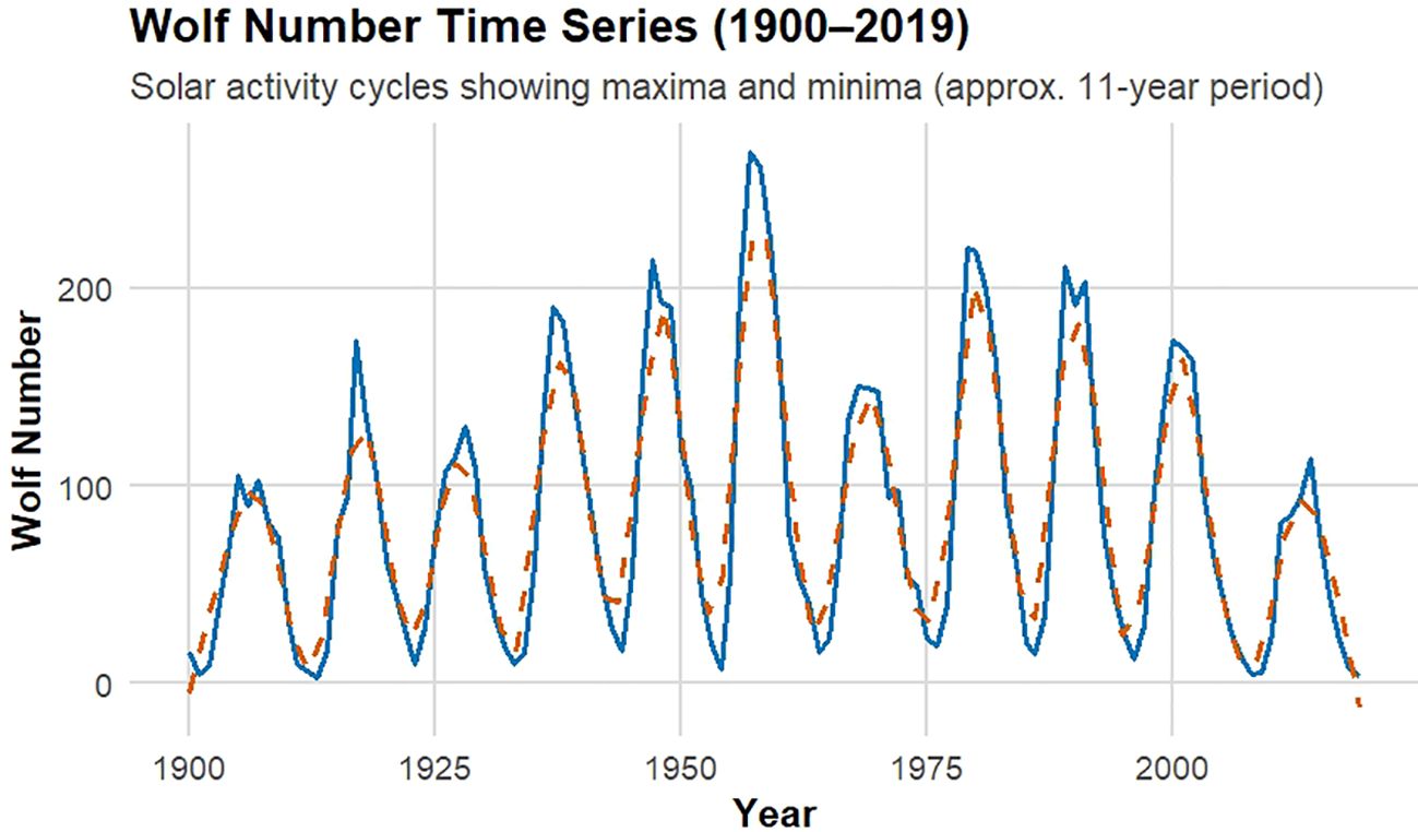 Figure 1. Wolf Number Time Series (1900–2019). The blue solid line represents the observed monthly Wolf sunspot numbers, while the orange dashed line shows the smoothed trend using an 11-year moving average to highlight the solar activity cycles (maximum and minimum).