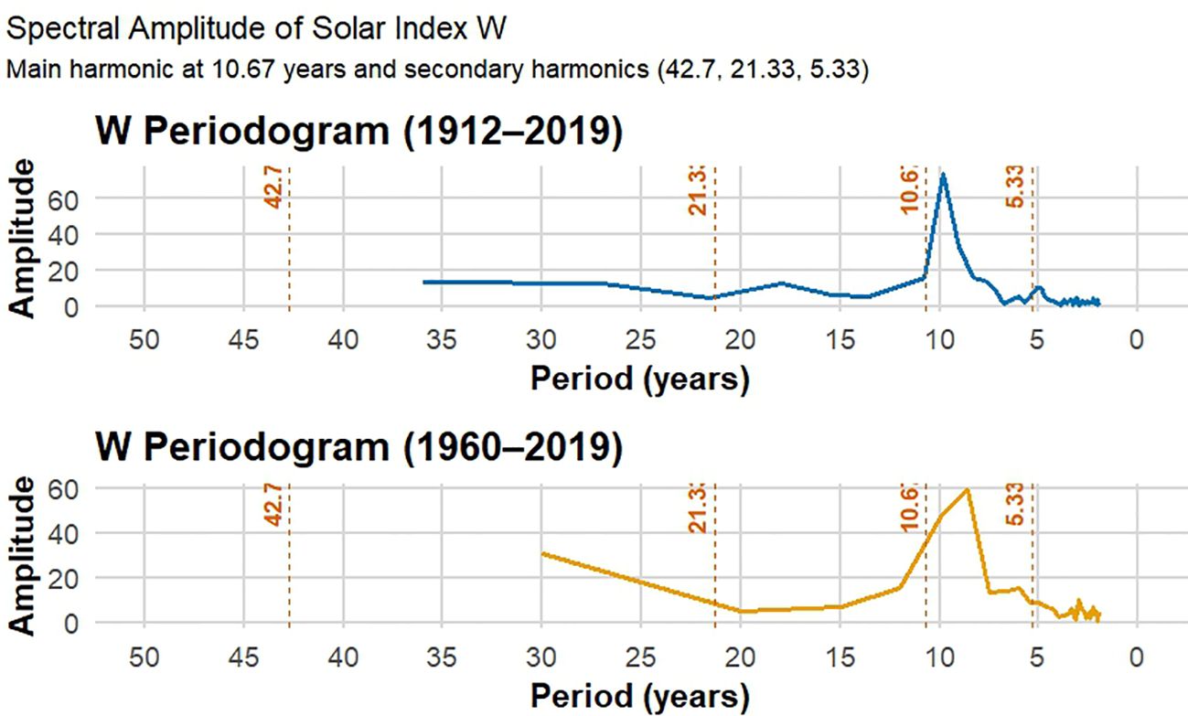 This graph shows the spectral amplitude of the normalized, filtered, and detrending (NFsT) yield time series, emphasizing significant cyclical components and their alignment with solar activity, particularly the dominant 10-12-year cycle.