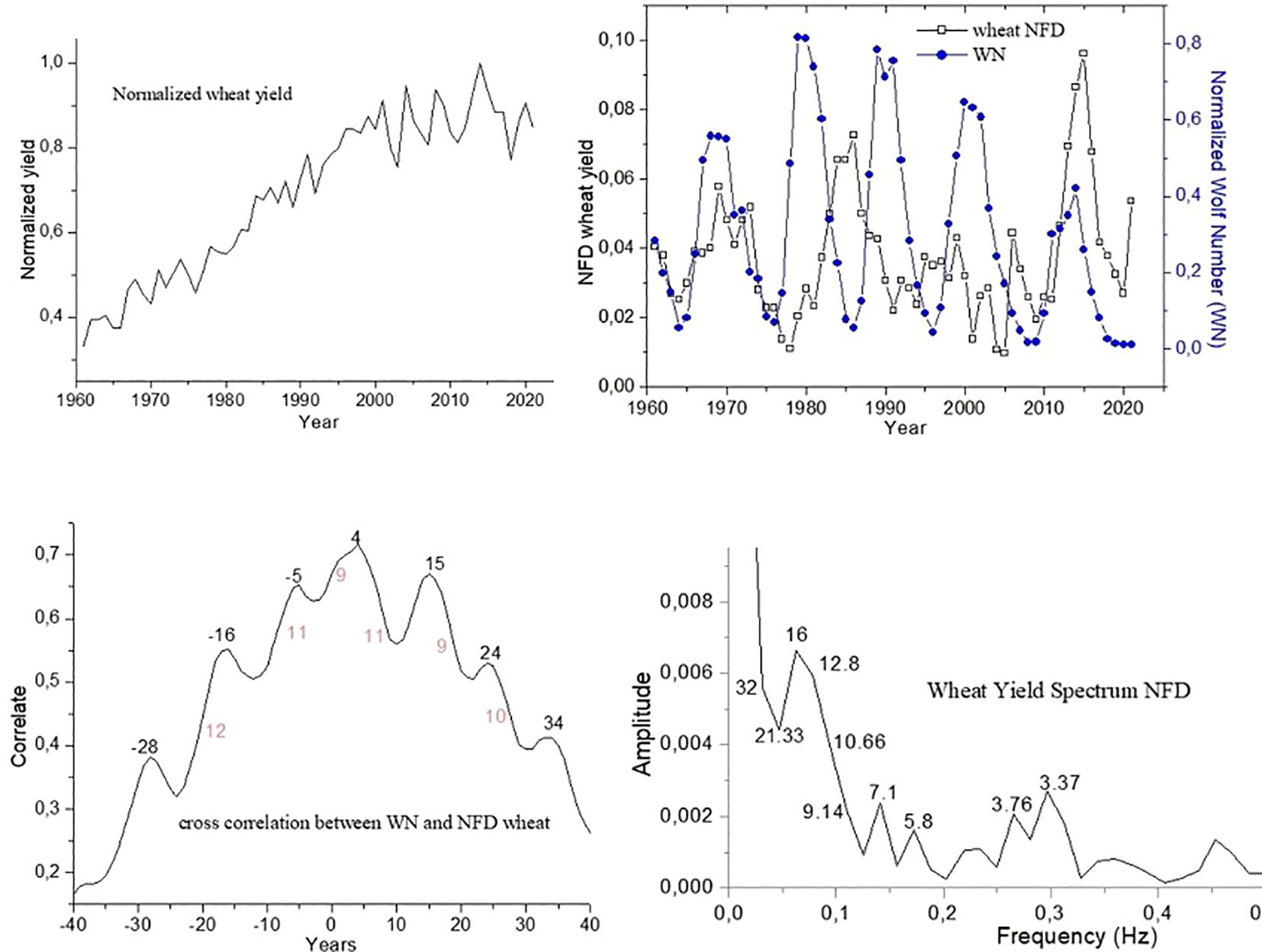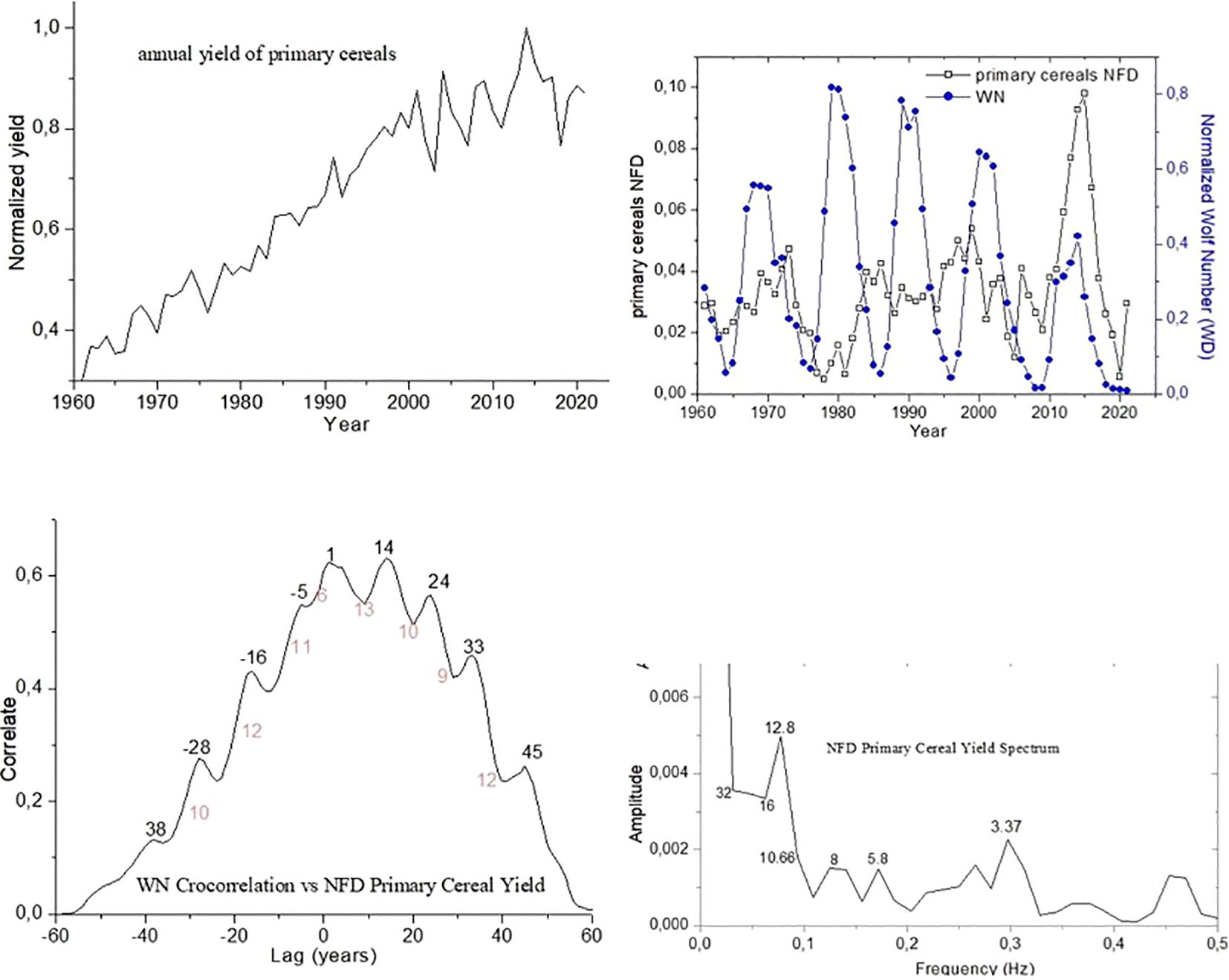 This graph presents the cross-correlation analysis between the yield variables and the Normalized Wolf Number (WN). It identifies key synchronization peaks, highlighting the temporal relationship between solar activity cycles and agricultural yield fluctuations.