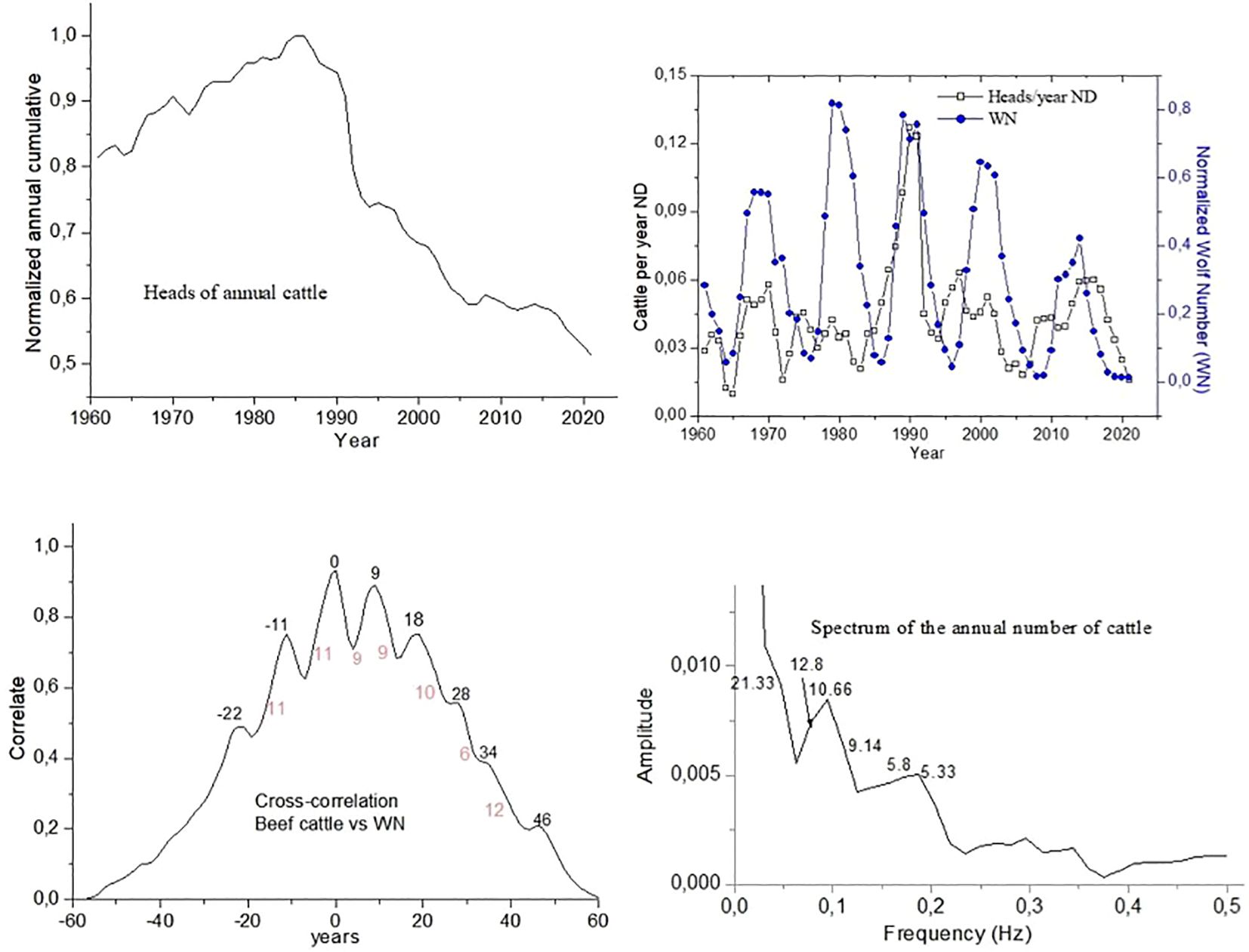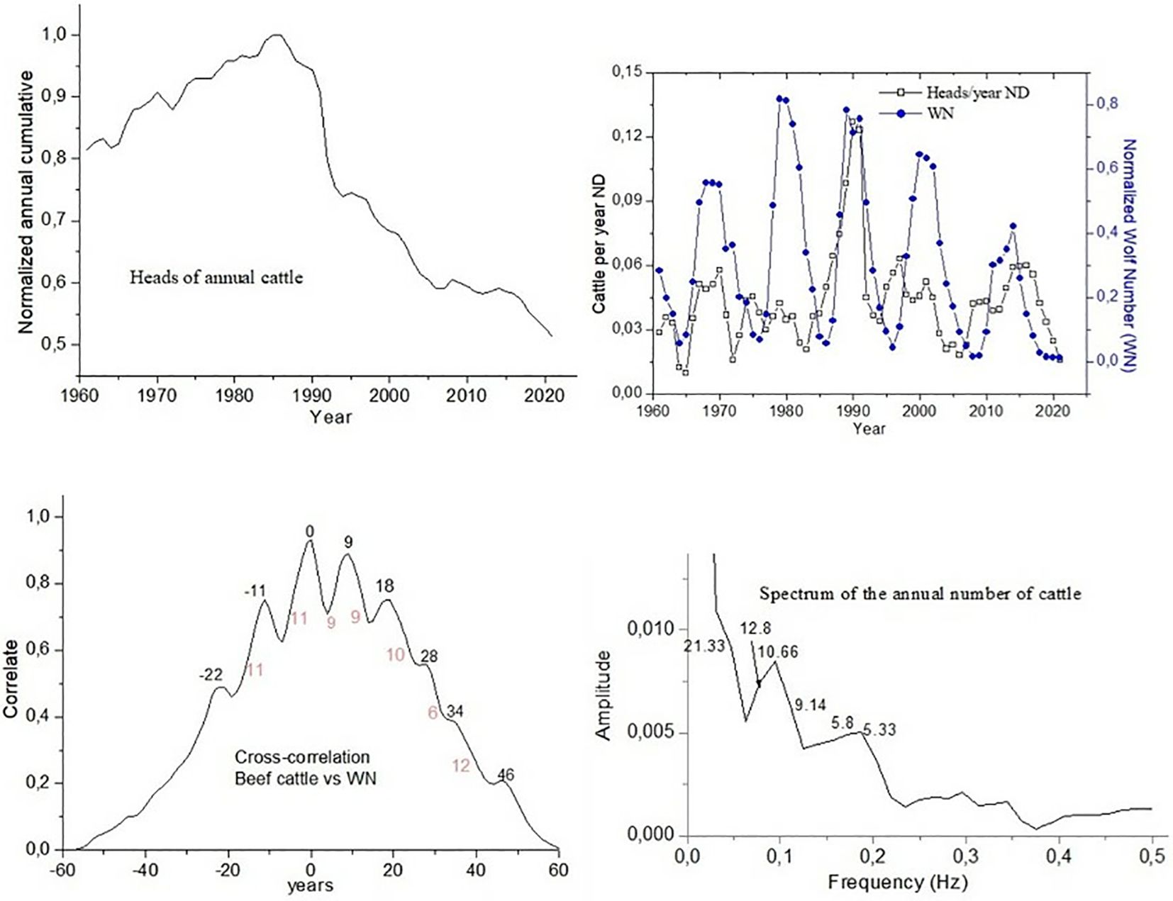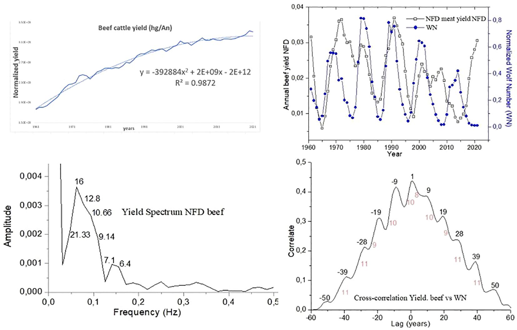 Figure 10. Cross-correlation plot between the yield variable and the solar index WN. Spectral amplitude plot of the normalized, filtered, and detrended yield time series (NFsT) for Cattle (Head).