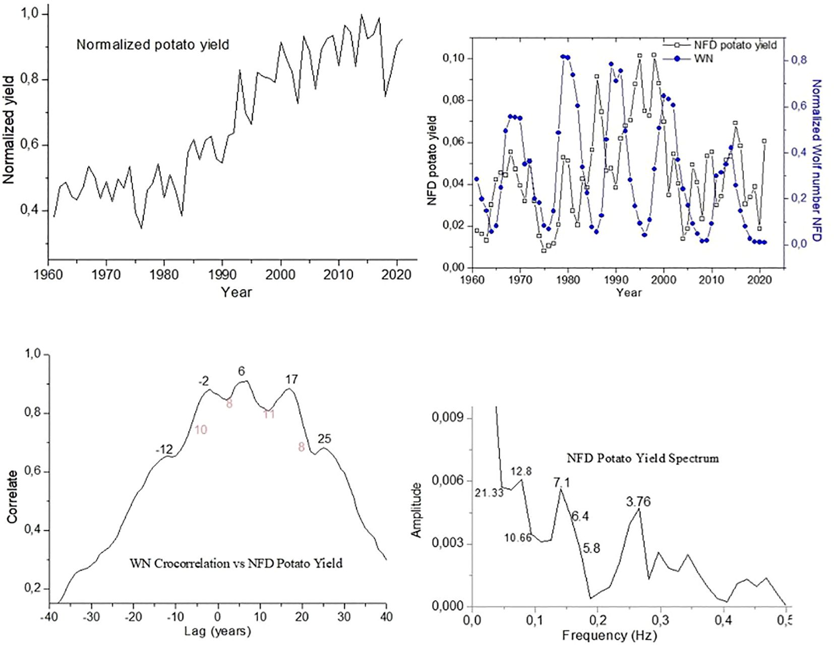 Figure 8. Cross-correlation plot between the yield variable and the solar index WN. Spectral amplitude plot of the normalized, filtered, and detrended yield time series (NFsT) for Potato.