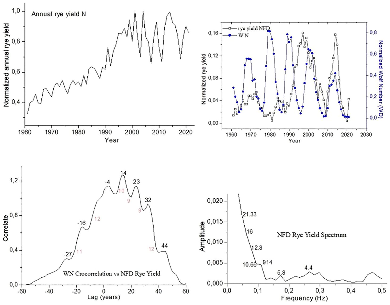 Figure 6. Cross-correlation plot between the yield variable and the solar index WN. Spectral amplitude plot of the normalized, filtered, and detrended yield time series (NFsT) for Rye.