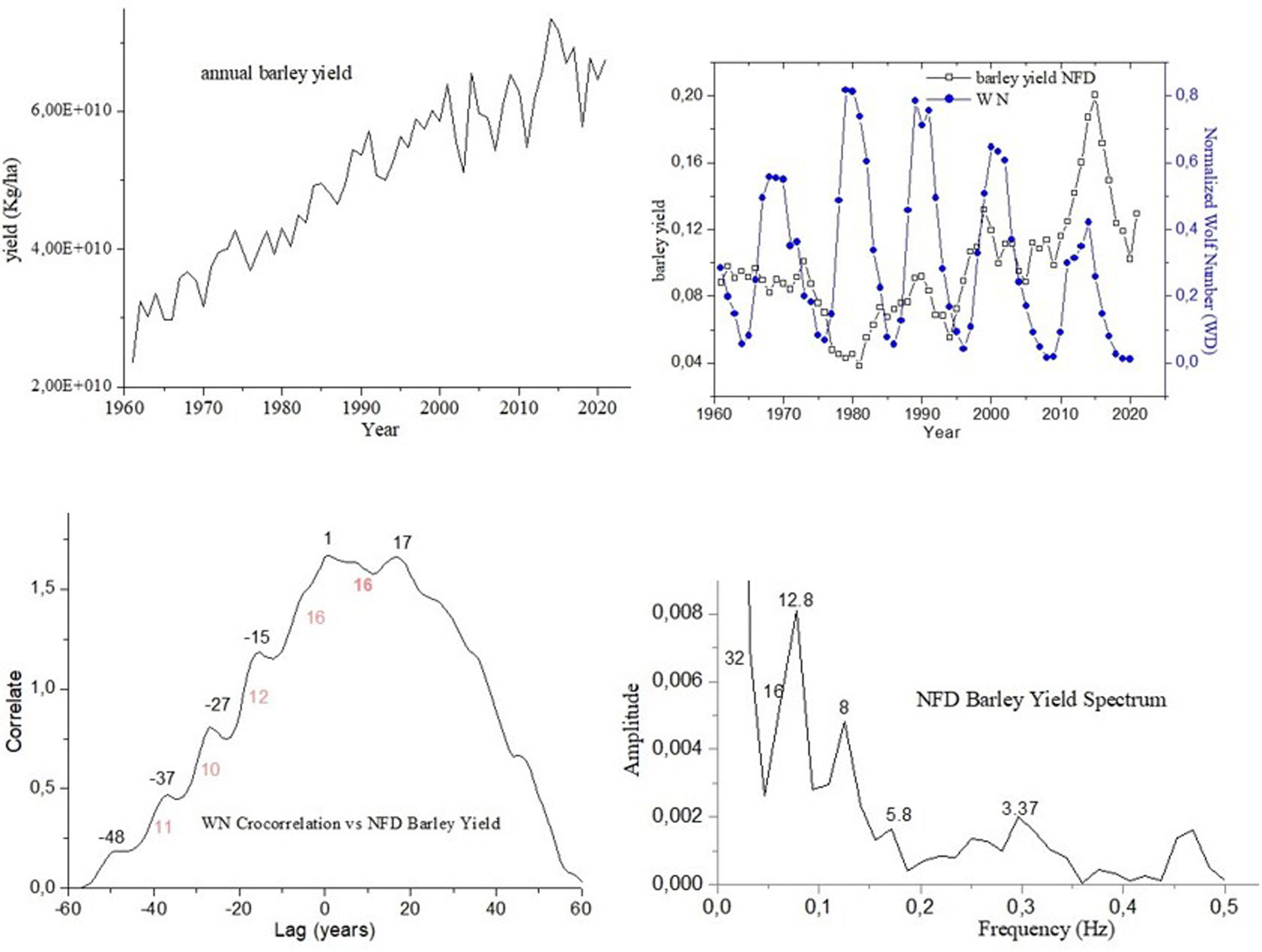 Figure 4. Cross-correlation plot between the yield variable and the solar index WN. Spectral amplitude plot of the normalized, filtered, and detrended yield time series (NFsT) for Barley.