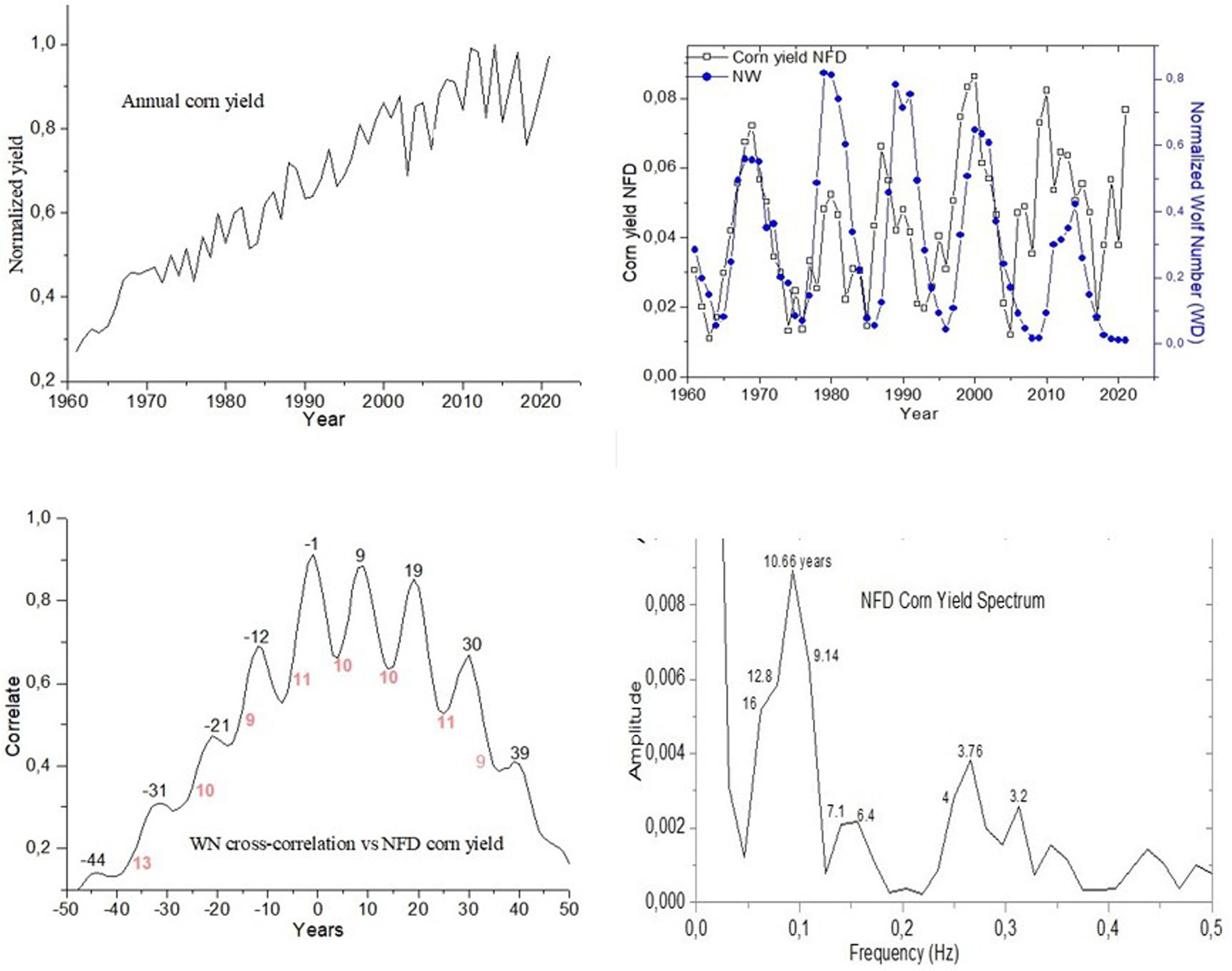 Figure 3. Cross-correlation plot between the yield variable and the solar index WN. Spectral amplitude plot of the normalized, filtered, and detrended yield time series (NFsT) for Corn.