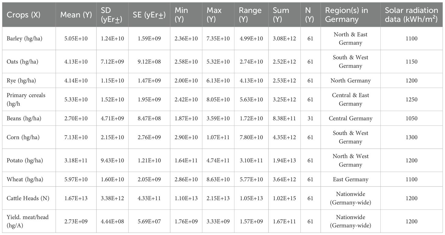 While core crops (cereals, fruits, etc.) are directly linked to climate variability modulated by the solar cycle, we have included livestock performance metrics (meat, milk, and population) as an indirect, but essential, proxy for the final link in the agricultural bioeconomic chain. Livestock productivity is heavily dependent on the quantity and quality of the underlying plant biomass, such as grazing pastures, green grass, and forage crops. These feed sources are directly influenced by solar-driven variations in climate factors like precipitation and temperature. Therefore, analyzing livestock performance provides a holistic indicator that reflects the aggregate response of the entire agricultural ecosystem—from plant production to animal output—to solar activity. The accurate assessment of crop yield potential requires careful consideration of environmental factors and physiological limits (Reddy, 1998). This approach ensures a comprehensive view of the synchronization effect across the German agricultural sector.