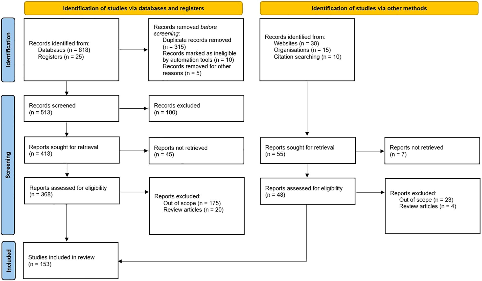 Flowchart detailing study identification and selection for review. It is divided into two processes: identification via databases and registers, and through other methods. From databases and registers, 843 records were identified, with 315 duplicates removed. After screening 513 records, 100 were excluded. Of 413 reports sought for retrieval, 368 were assessed for eligibility, resulting in 153 studies included. From other methods, 55 reports were sought, with 7 not retrieved. Of the 48 assessed, 27 were excluded as out of scope or review articles.