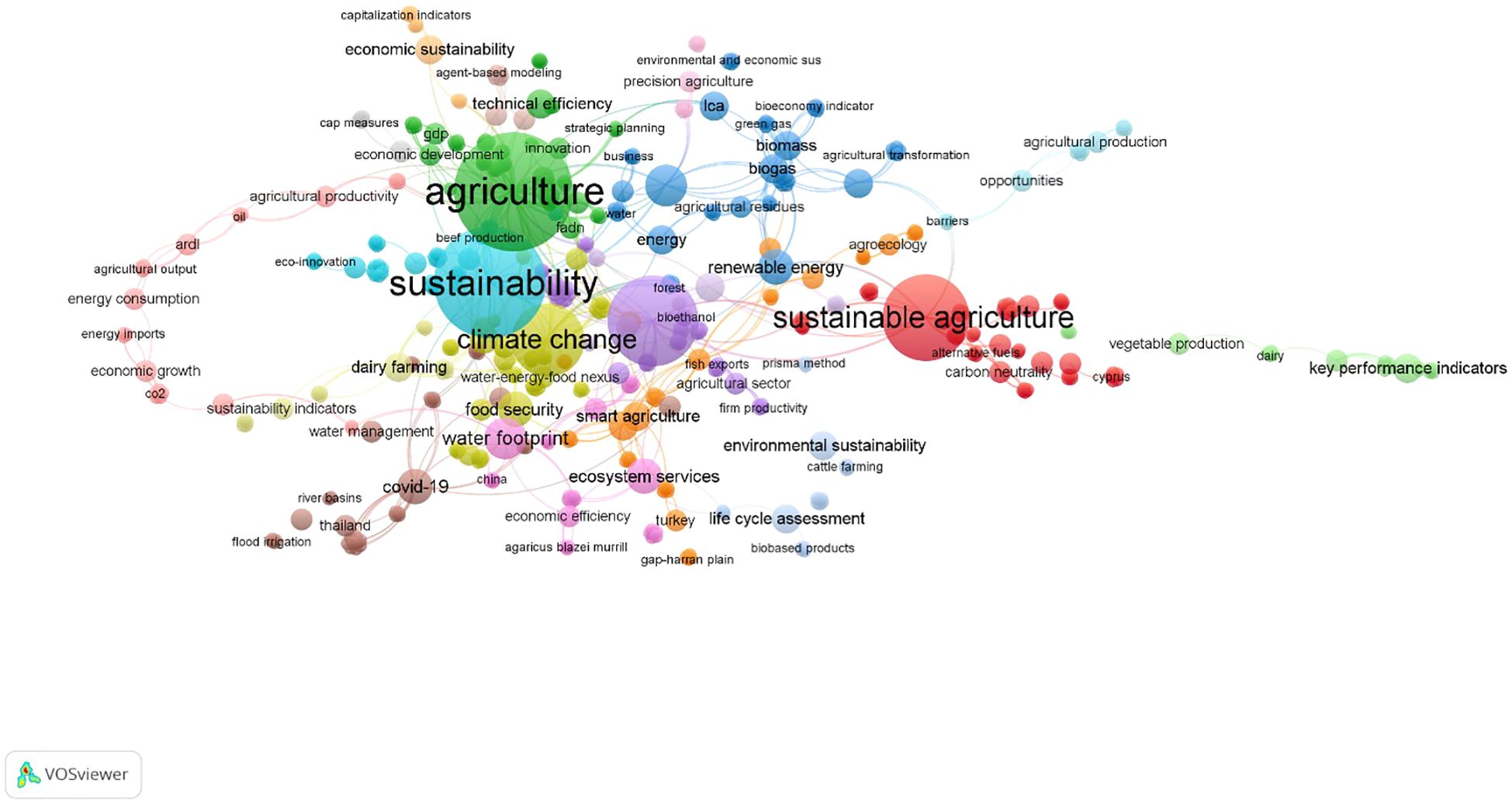 Colorful network map illustrating interconnected terms related to sustainability, agriculture, climate change, and energy. Larger nodes such as “agriculture,” “sustainability,” and “sustainable agriculture” are central, indicating key concepts. Connected smaller nodes represent related topics like “renewable energy,” “climate change,” and “food security.