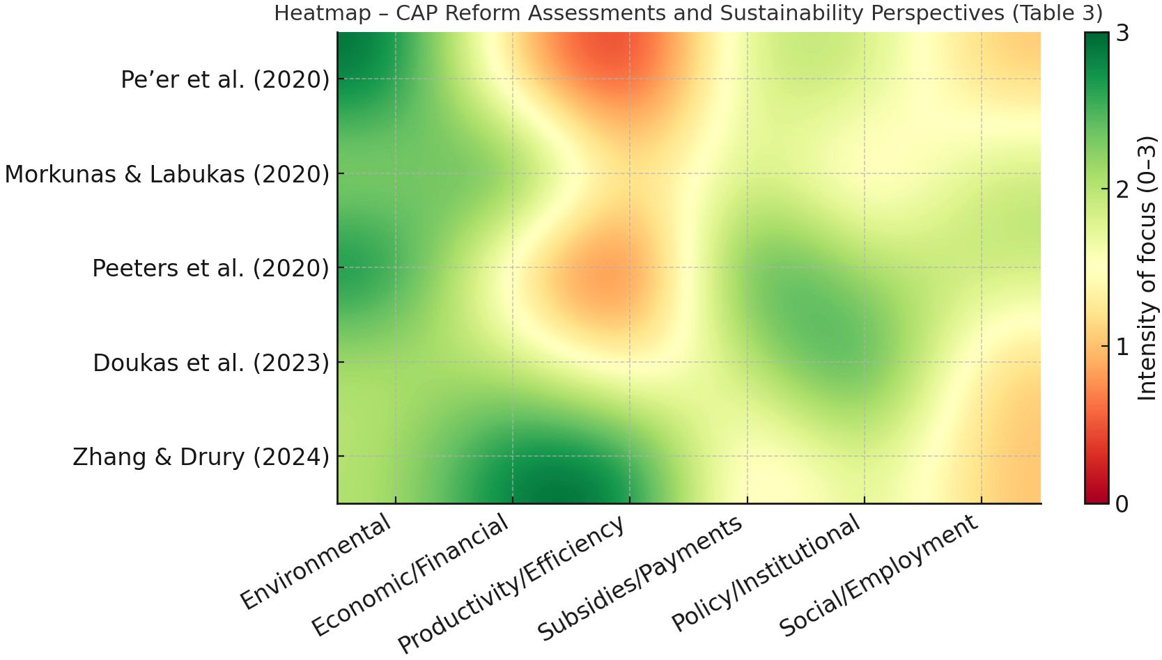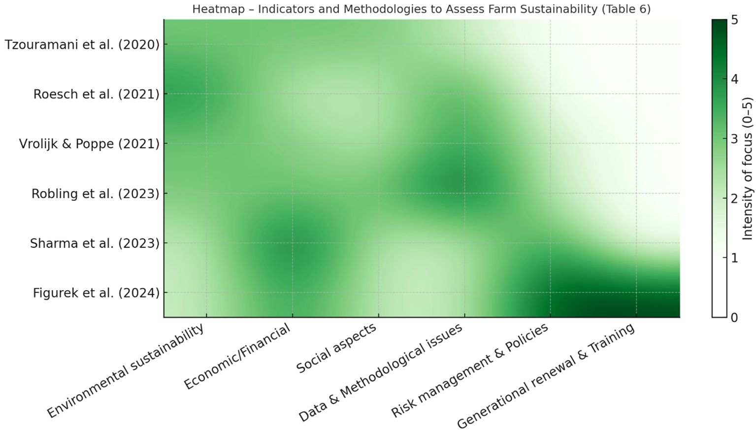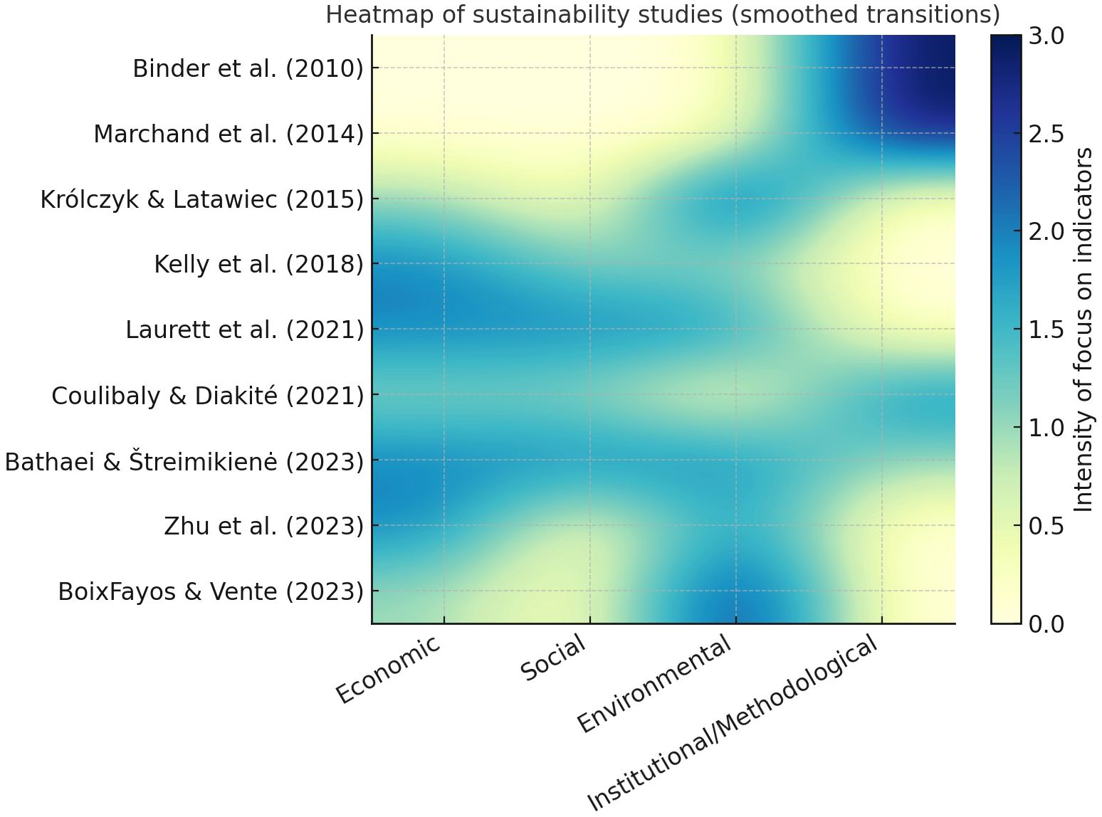 Heatmap of sustainability studies showing smoothed transitions across different years and categories: economic, social, environmental, and institutional/methodological. Intensity of focus ranges from zero to three, with darker tones indicating higher intensity. Studies are listed from 2010 to 2023.