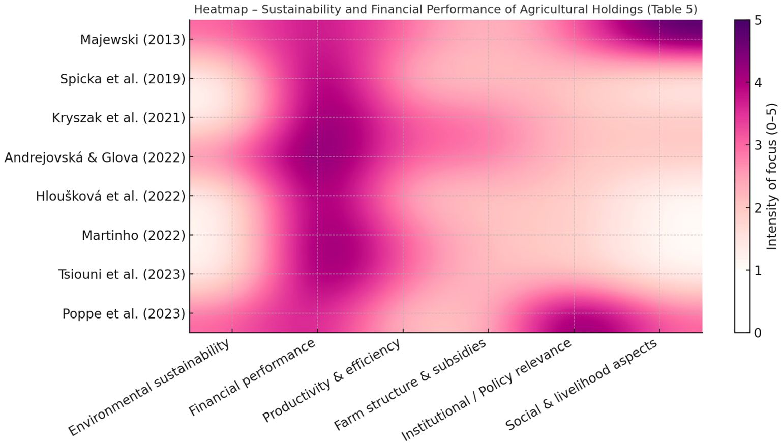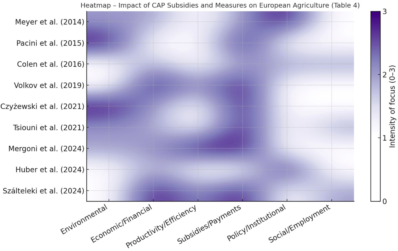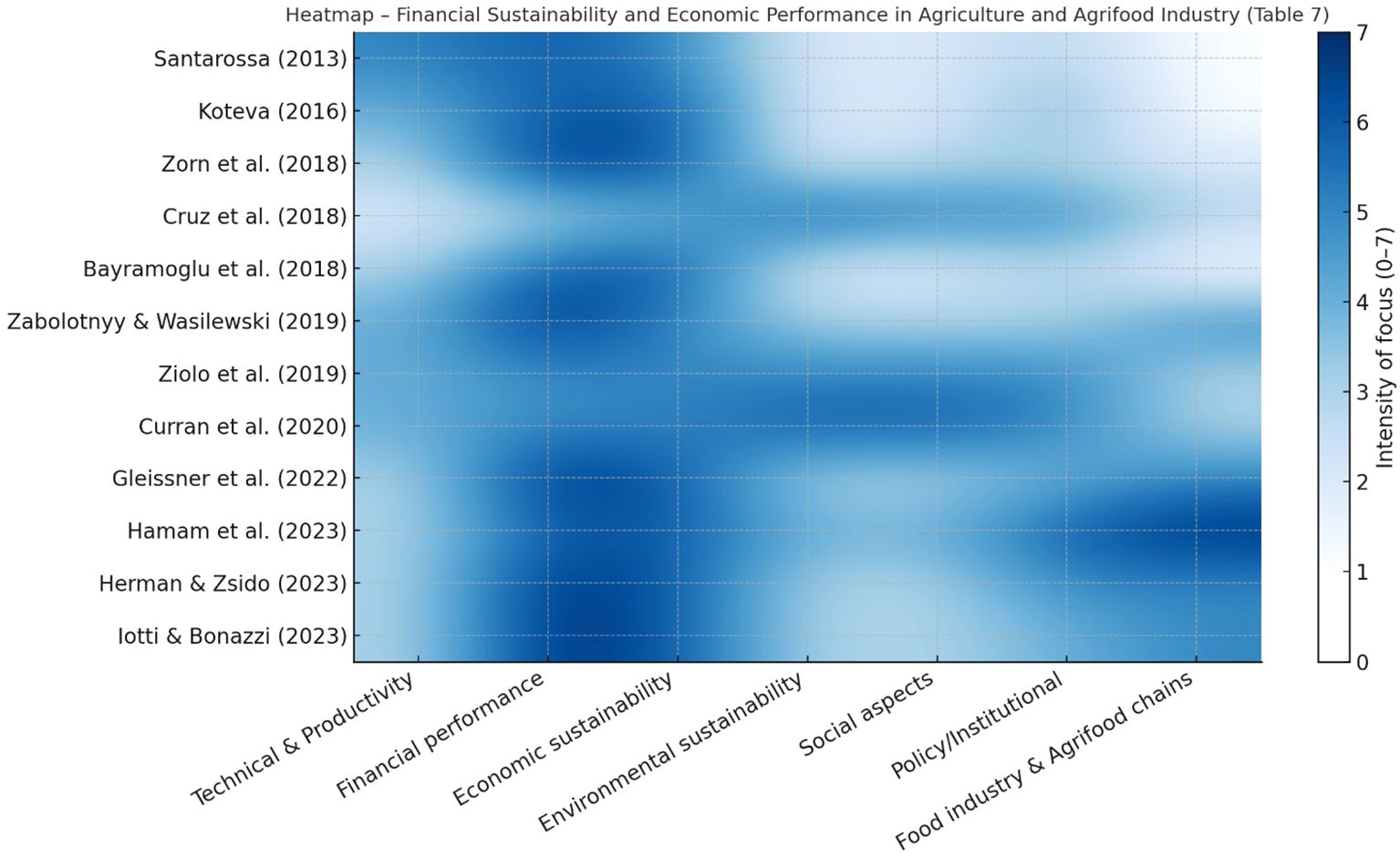 Heatmap of sustainability studies showing smoothed transitions across different years and categories: economic, social, environmental, and institutional/methodological. Intensity of focus ranges from zero to three, with darker tones indicating higher intensity. Studies are listed from 2010 to 2023.