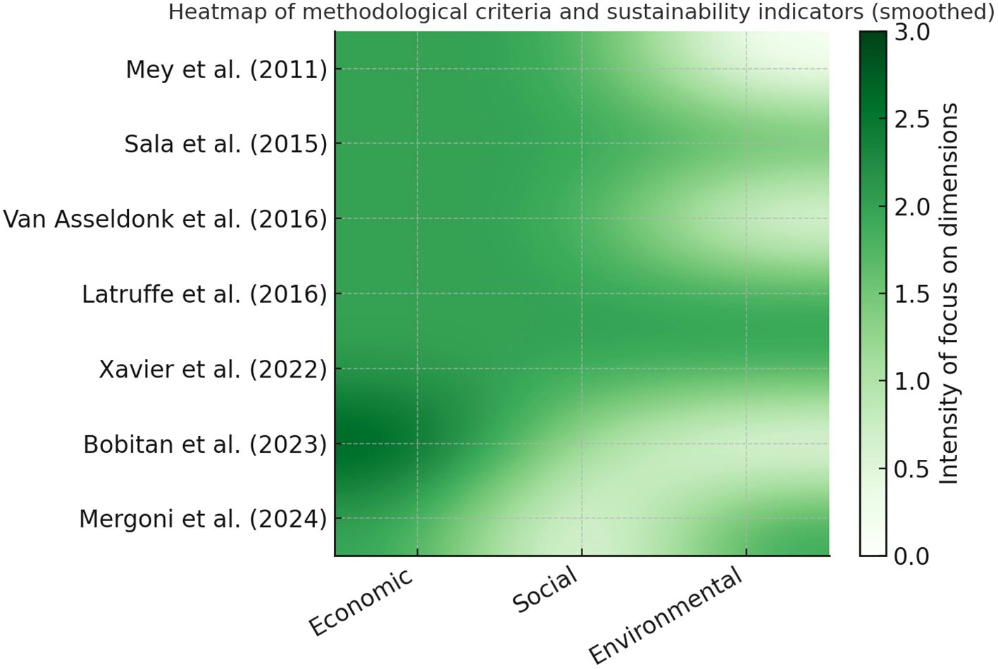 Heatmap depicting methodological criteria and sustainability indicators, with axes labeled Economic, Social, and Environmental. Rows correspond to studies by Mey et al. (2011) through Mergoni et al. (2024). A color gradient from white to dark green represents increasing intensity of focus on dimensions, with a scale from 0.0 to 3.0.