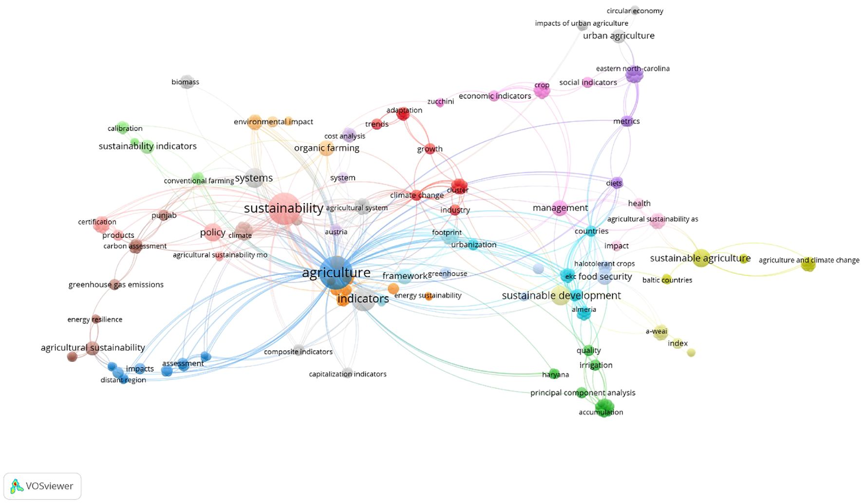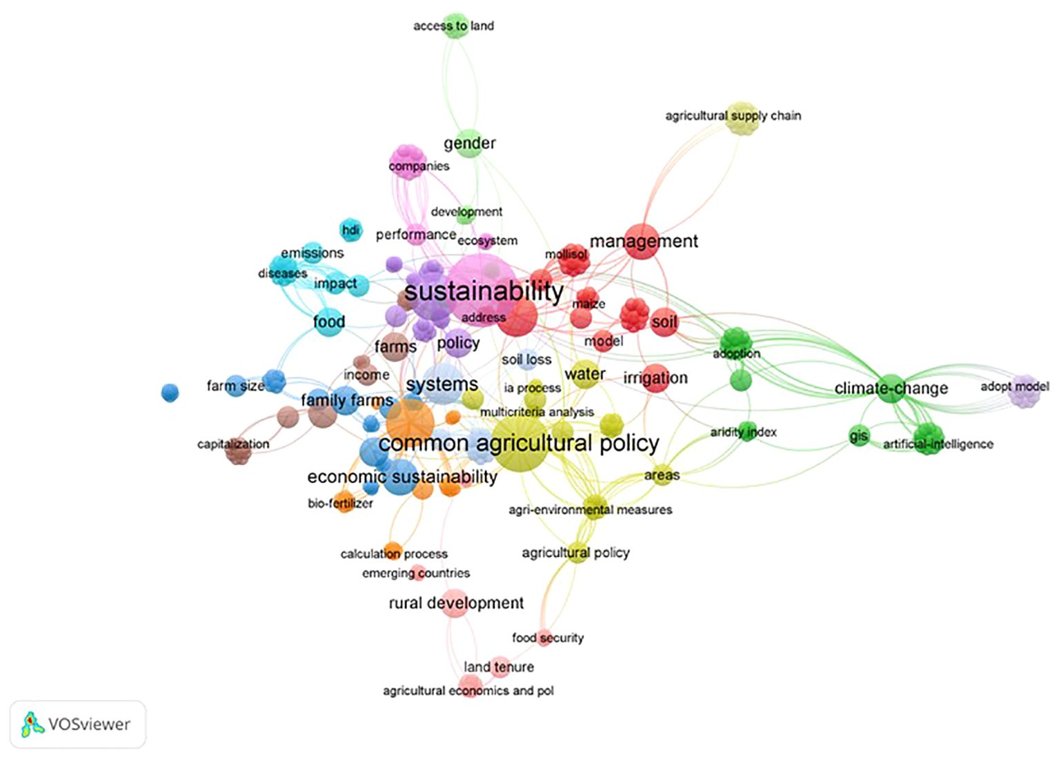 Visualization of interconnected concepts related to sustainability, highlighting terms like common agricultural policy, climate change, management, and systems. Different colored nodes represent grouped themes and their connections via linked lines. Created with VOSviewer.