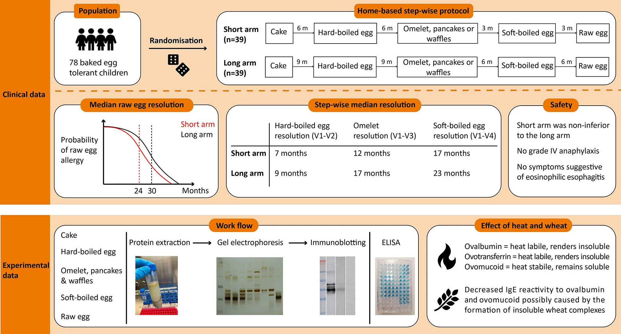 Baked egg tolerant children above 12 months of age were randomly assigned to a short- or long arm protocol. In the short arm, egg-tolerance induction was studied over 18 months compared to 30 months in the long arm. Children were guided through this protocol involving the step-wise introduction of increasingly allergenic forms of egg starting with baked egg offered as cake, followed by hard-boiled egg, omelet/waffle/pancake, soft-boiled egg, and finally raw egg. We hereby designed this protocol based on the influence of thermal processing in the presence or absence of wheat on egg proteins, as investigated by ELISA, SDS-PAGE, and immunoblotting. At inclusion, children either passed an in-hospital cake challenge or had ovomucoid sIgE ≤1.2 kUA/L, which was considered safe for introduction at home.