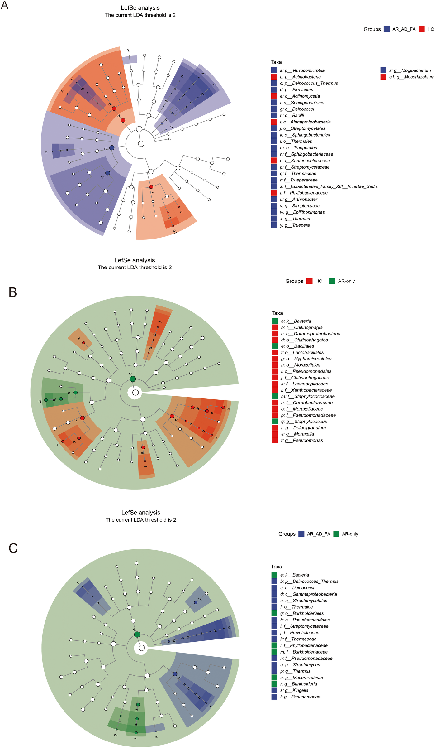 (A–C) The differentially expressed genera and pairwise comparisons among the three groups (AR-AD-FA, AR only and HC groups) from LefSe analysis of the nasal are presented. N-nasal; AR-AD-FA—allergic rhinitis combined with atopic dermatitis and food allergy, AR only—allergic rhinitis, HC—healthy controls.
