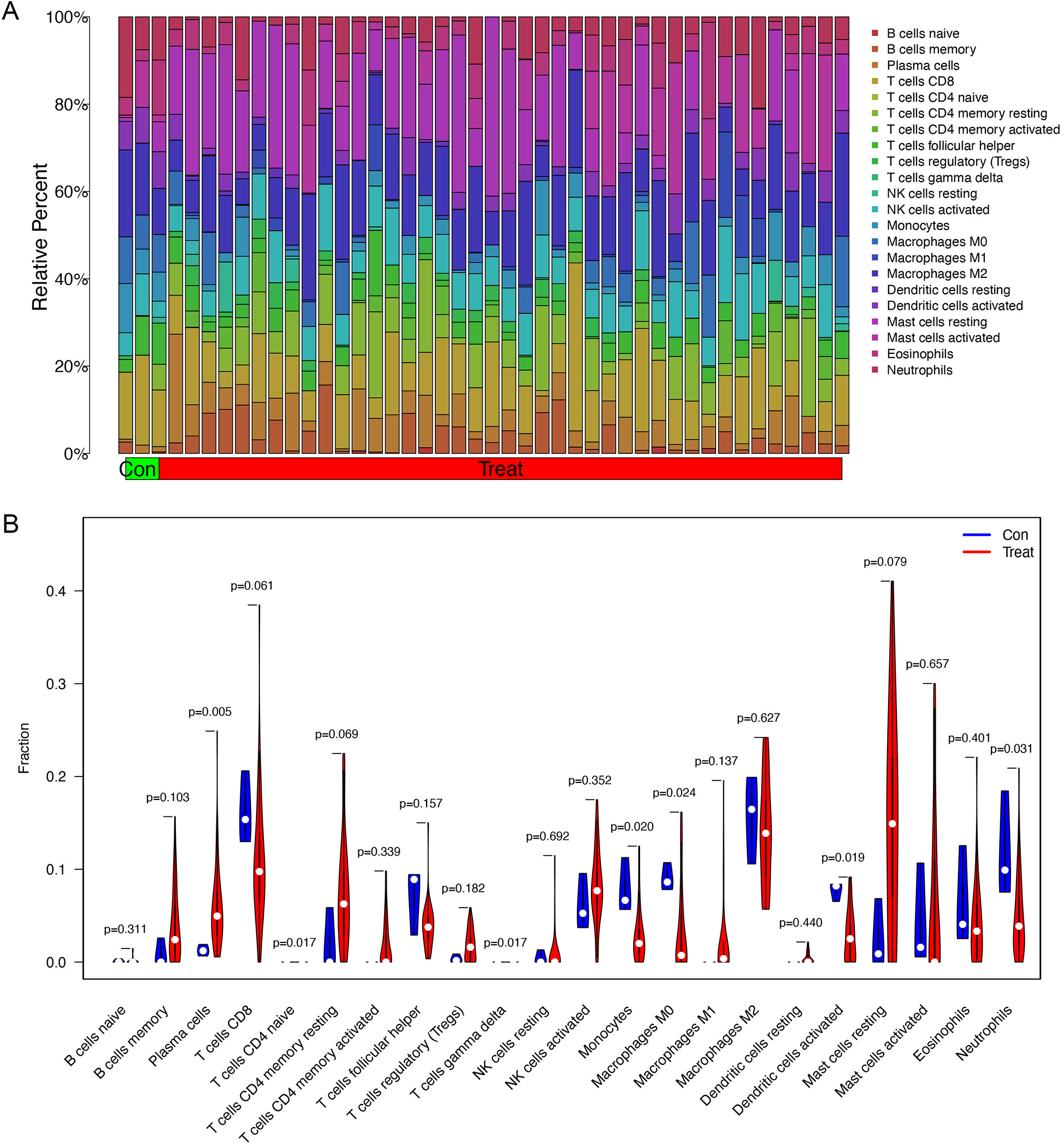 Immune cell infiltration analysis between asthma and healthy subjects. (A) The proportion of immune cells in each sample. (B) Differential infiltration of immune cells between healthy controls and asthma patients. Plasma cells, T cell CD4 naive, T cell gamma delta, monocytes, macrophages M0, activated dendritic cells and neutrophils have significant differences between two groups.