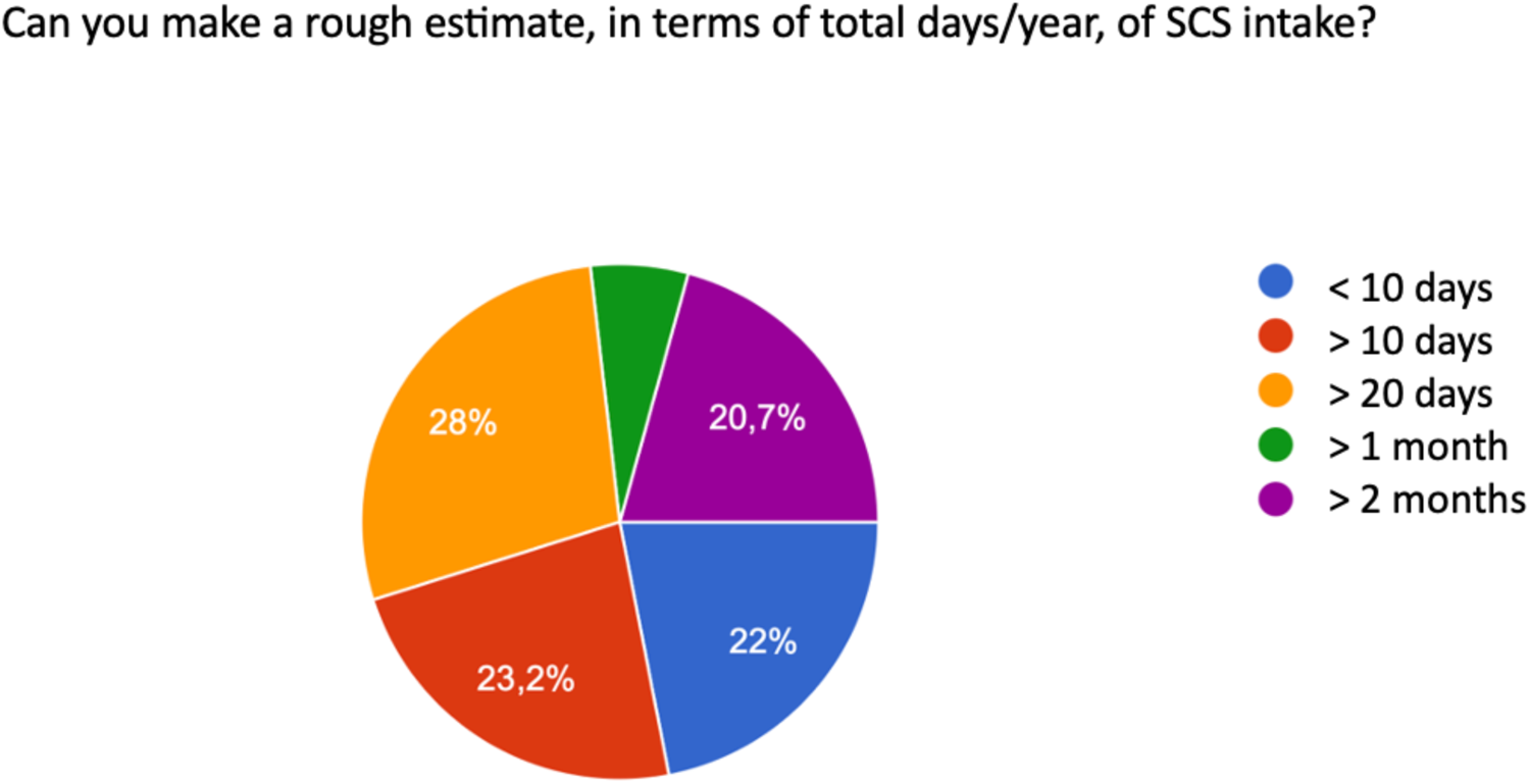 These values are summarized in an approximate estimate that considers the total days of systemic corticosteroid use, compared to the calendar year, in the following way: 22% therapy less than 10 days per year, 23.2% greater than 10 days per year, 28% greater than 20 days per year, and 20.7% use for a period greater than two months per year (Figure 5).