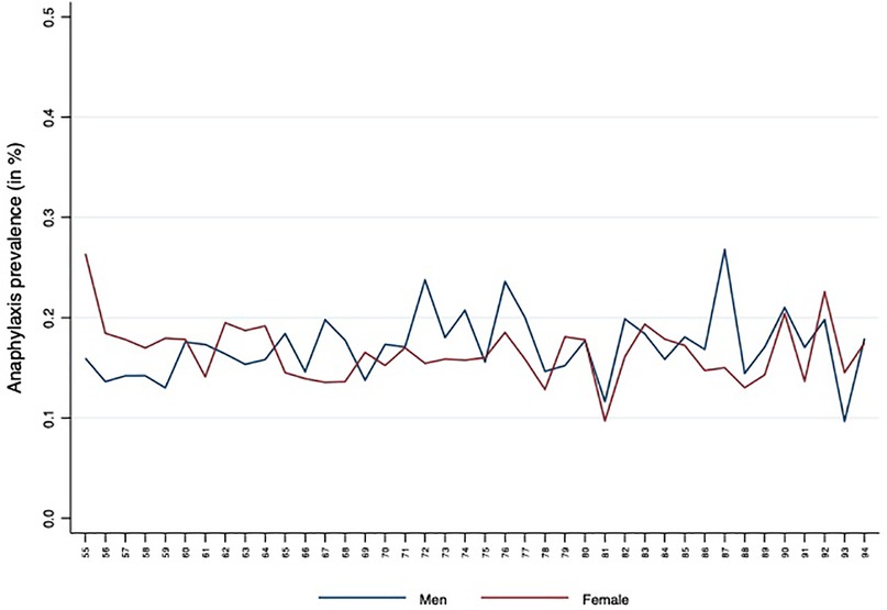 Figure 1 illustrates the prevalence of anaphylaxis (in %) across different ages for men (blue line) and women (red line) in the elderly population. While both genders exhibit some fluctuations across age groups, no consistent sex-based pattern was identified. Age showed statistically significant associations with prevalence, but given the considerable sample size, even minor absolute differences reached significance. Overall, the prevalence of anaphylaxis remained low and relatively stable, with modest increases in older age groups. These findings suggest that while age-related variations exist, their clinical relevance should be interpreted with caution when assessing anaphylaxis risk in elderly populations.