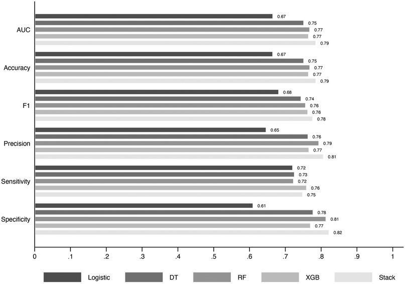 Figure 2. Performance metrics (AUC, accuracy, precision, sensitivity, specificity, F1-score) for logistic regression (LR), decision tree (DT), random forest (RF), extreme gradient boosting (XGB), and the stacked ensemble model. Confidence intervals for the stacked model are provided in the note. The CI for the stack figures was AUC (0.77–0.80), Accuracy (0.77–0.80), F1 (0.76–0.79), Precision (0.78–0.83), Sensitivity (0.72–0.77), and Specificity (0.80–0.85).