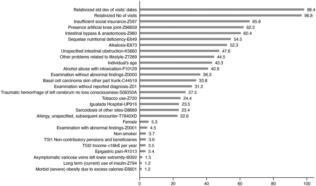 Figure 3. Variable importance rank for the stacked model. Variable importance ranking for the stacked model. Higher scores (0–100) indicate a greater absolute influence on model predictions, regardless of the directionality. The top predictors include healthcare utilisation patterns, diagnostic codes, and socioeconomic indicators.