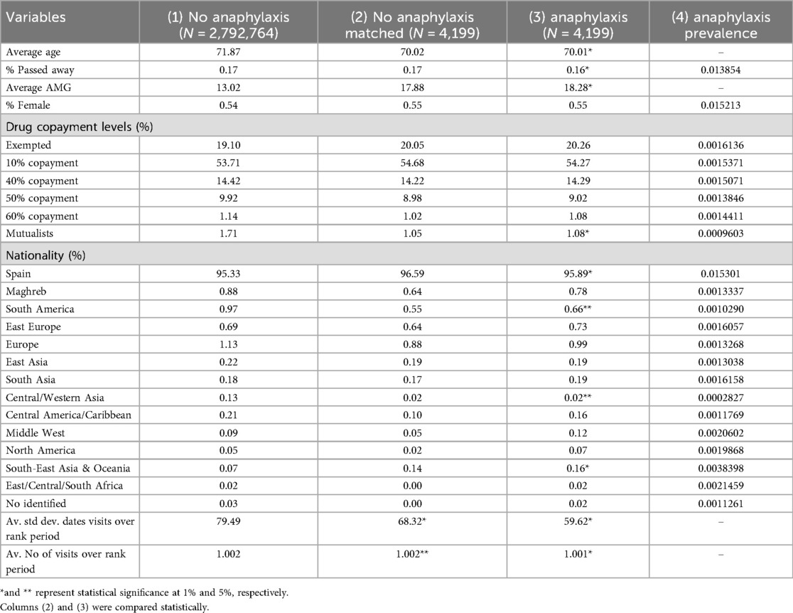 Table 1 provides the descriptive statistics for the entire population, the matched sample, and the groups disaggregated by anaphylaxis diagnosis. Statistically significant differences were identified for variables typically associated with a higher prevalence of anaphylaxis, such as age, mortality rate, chronic comorbidities, nationality, and drug co-payment levels (15). The matched sample effectively reduced disparities across these variables, ensuring comparability between the groups. The average age of individuals diagnosed with anaphylaxis was marginally lower compared to those without it. At the same time, the presence of chronic comorbidities, as reflected in the AMG (Adjusted Morbidity Group) index, was notably higher in the anaphylaxis group. Although the proportion of females in the population was similar across groups, no significant gender-based differences were observed. Differences were observed across co-payment categories between groups.