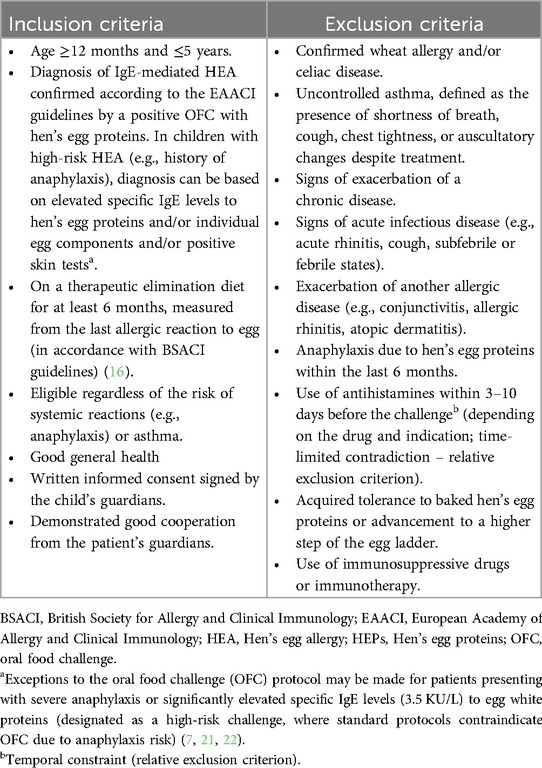 At each step of the ladder, a single food product was selected and applied consistently across both study arms. The quantity of hen's egg proteins at each stage was determined based on recommendations from the PRACTALL consensus report (7) and the BSACI guidelines (15).