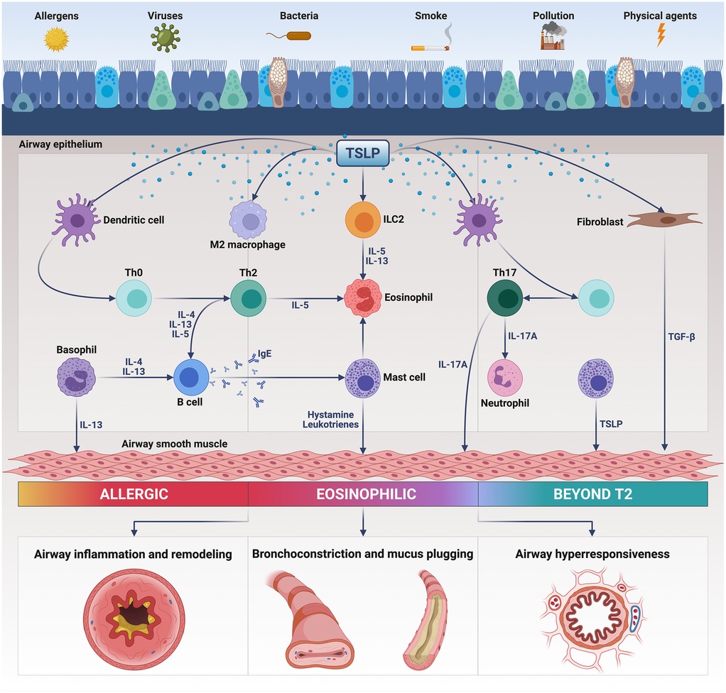 Figure 1. Pathogenic actions of thymic stromal lymphopoietin (TSLP) in asthma. Released from injured bronchial epithelium, TSLP triggers the inflammatory responses underlying T2-high and T2-low asthma by activating several immune cells including dendritic cells, Th2/Th17 lymphocytes, group 2 innate lymphoid cells (ILC2), eosinophils, mast cells, basophils, and M2 macrophages. TSLP also activates airway structural cells such as fibroblasts and smooth muscle cells. As a consequence of these pleiotropic actions, TSLP induces airway inflammation and remodeling, bronchial hyperresponsiveness, bronchoconstriction and mucus plugging. This original figure was created by the authors using “BioRender.com”.