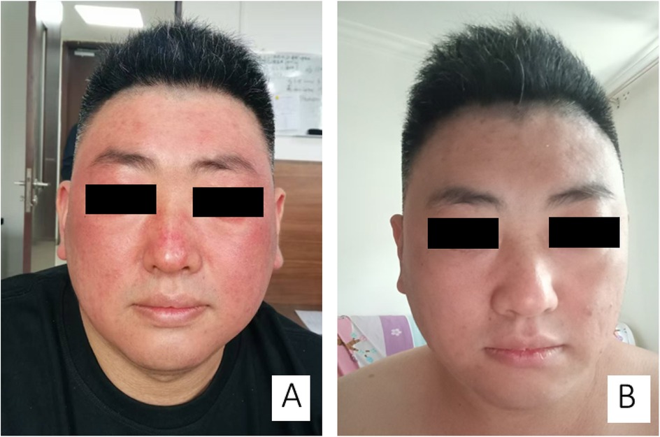 Physical examination: temperature 36.9°C, heart rate (HR) 72 bpm, respiratory rate (RR) 18, blood pressure (BP) 122/72 mmHg. Liver function tests revealed elevated alanine aminotransferase (ALT) at 83.2 U/L (normal range: 9–50 U/L) and slightly increased direct bilirubin at 8.48 μmol/L (normal range: 0–8.0 μmol/L). Other laboratory tests, such as complete blood count (CBC), erythrocyte sedimentation rate (ESR), renal function, electrolytes, rheumatoid factor, total IgE, hepatitis B, hepatitis C, syphilis, HIV, urinalysis, and stool routine, showed no significant abnormalities. Electrocardiogram and chest x-ray showed normal findings. The patient reported normal liver function test results prior to initiating secukinumab therapy. He was diagnosed with facial eczema due to secukinumab with a score of 5 on the Naranjo scale suggesting a probable drug side effect, and hepatic abnormality was recognized as being induced by secukinumab. He received a prescription including oral compound glycyrrhizin, olopatadine hydrochloride, triprolidine hydrochloride, topical pimecrolimus for eczema treatment, and polyene phosphatidylcholine for liver protection therapy. The skin lesions resolved completely 1 week after treatment (Figure 1B). Transaminases and bilirubin normalized after 2 weeks of therapy. The patient delayed secukinumab administration by 2 weeks and continued 300 mg secukinumab subcutaneous injection on a regimen of every 4 weeks. No recurrence of similar rash or other adverse effects was observed during the subsequent follow-up period over 5 months.