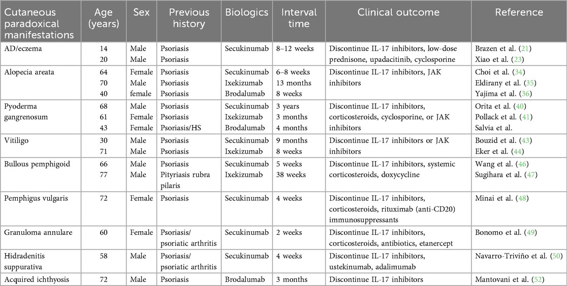 Here, we focus on discussing cutaneous paradoxical reactions of IL-17 inhibitors. We have summarized the clinical information regarding paradoxical skin reactions possibly induced by IL-17 inhibitors before August 2025 in PubMed and selected some cases in each paradoxical reaction shown in Table 1. Cutaneous paradoxical manifestations are diverse, with atopic dermatitis (AD) as the most common. Initial reports by Hattori et al. (20) documented AD exacerbation in a psoriasis patient receiving secukinumab. The paradoxical eczematous response triggered by IL-17 inhibitor biologics has been well documented with various cases published (21–23). Subsequent studies revealed de novo AD development in ankylosing spondylitis (AS) (24) and psoriasis populations. In a meta-analysis, PubMed, Embase, Cochrane Library, and Web of Science databases were searched for studies published before 1 March 2022 that reported at least one adverse event (AE). Dichotomous variables and 95% confidence intervals (CI) were analyzed using R software (version 4.1.3). Eczema was reported in 67 out of 1,230 patients who received IL-17 inhibitor biologics (25). Upon discontinuing biologics and switching to oral cyclosporine, antihistamines, Janus kinase 1 inhibitor, and topical glucocorticoids, patients experienced significant improvement in their skin lesions.