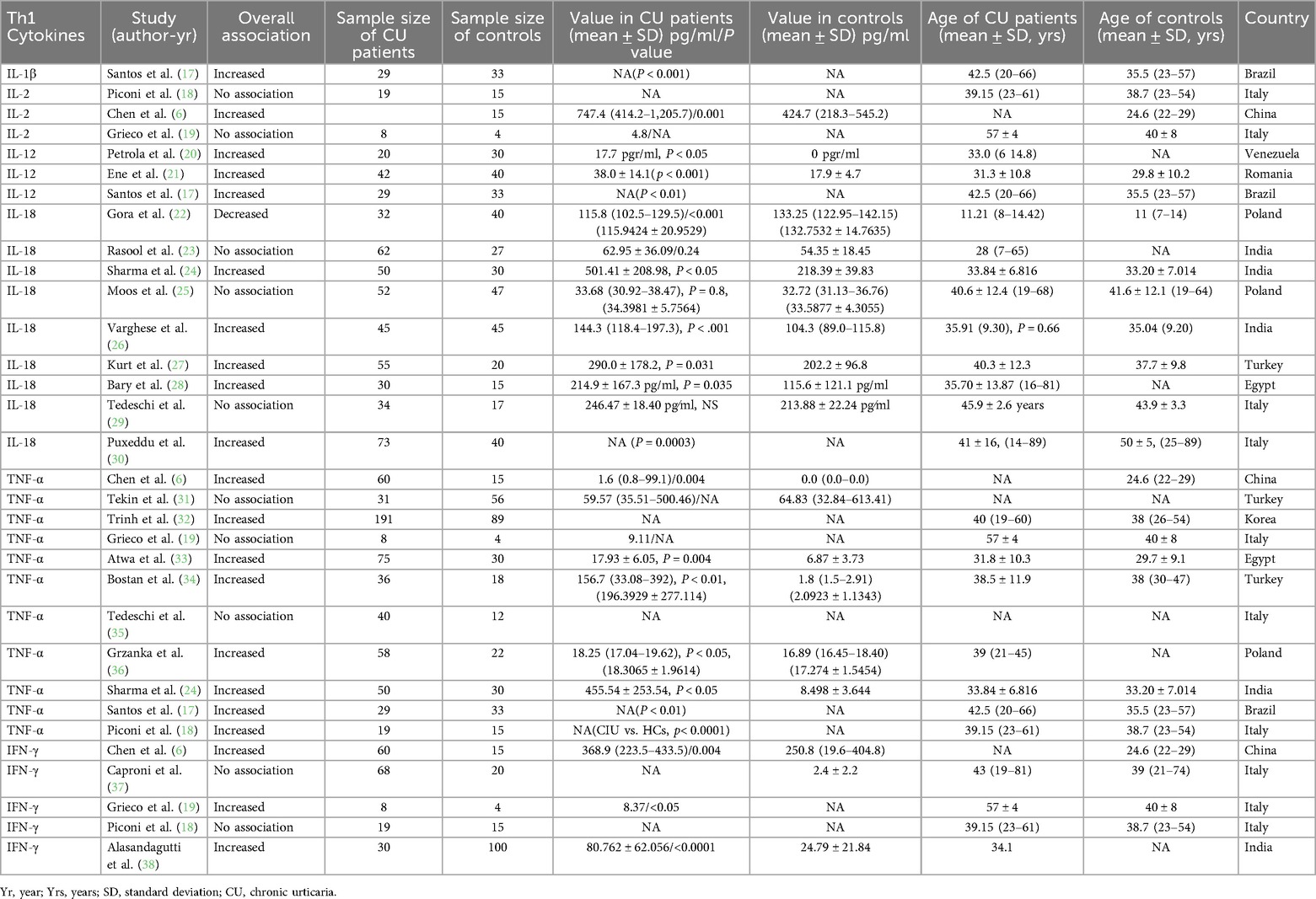 Despite these limitations, the results of this review and meta-analysis provide high-quality evidence-based insights into the associations between serum Th1, Th2, and Th17 cytokines and CU. In conclusion, Th1 and Th17-derivated cytokines play crucial roles in the pathogenesis of CU. CU is thus characterized as a chronic inflammatory state mediated by diverse cytokines and autoimmune mechanisms. These findings may help inform clinical guidelines for CU diagnosis by incorporating serum TNF-α and IL-17 levels. However, the clinical cut-off values, sensitivity, specificity, and practical implementation of these biomarkers have not yet been explored. Therefore, well designed and large-scale studies are needed to determine the optimal cutoff levels of TNF-α and IL-17.