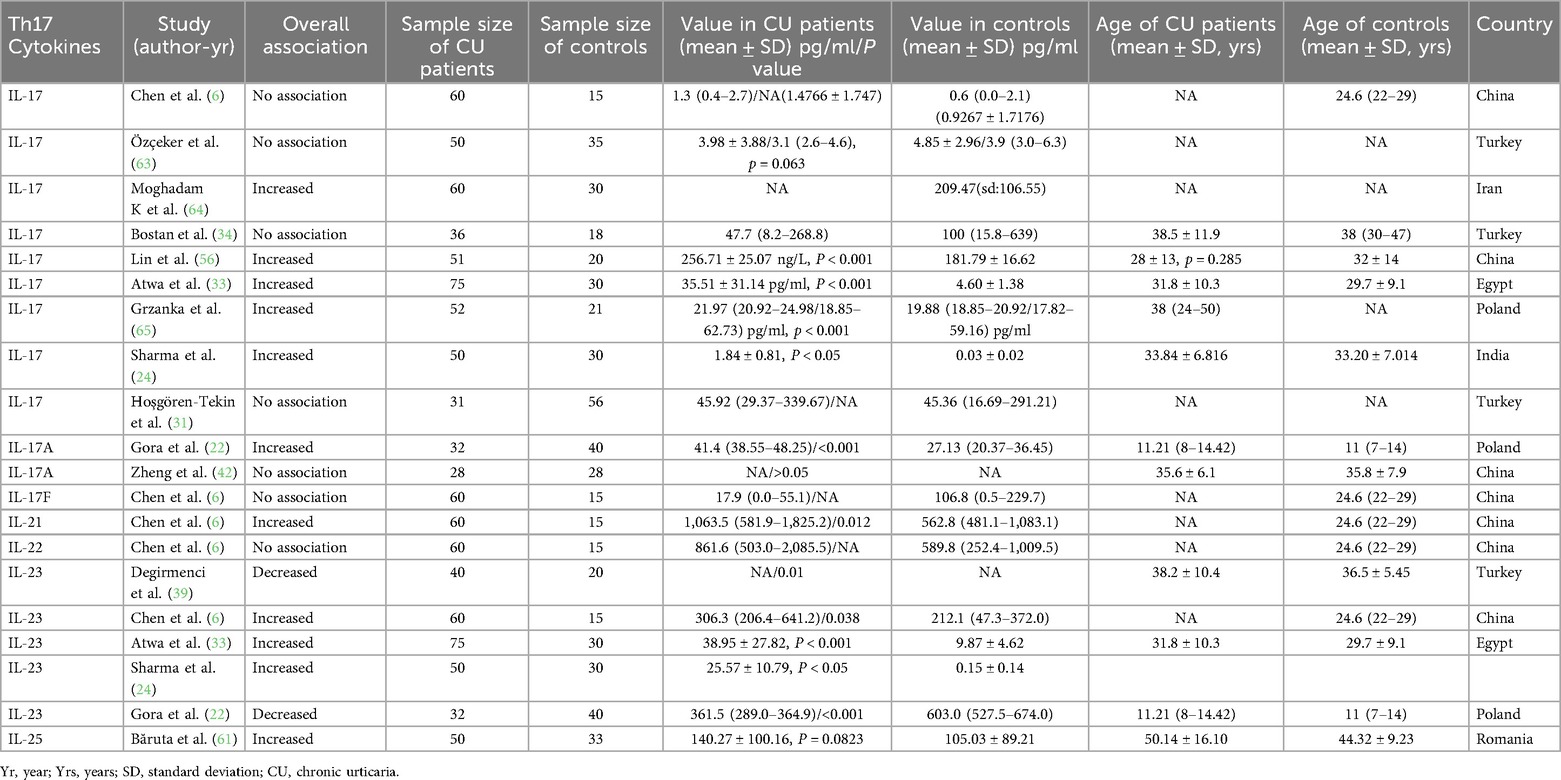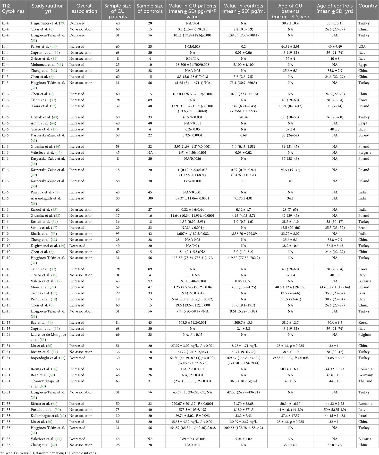 A limitation of this systematic review and meta-analysis is the heterogeneity in assay methods. Variability in laboratory methods across studies (e.g., ELISA, multiplex assays) may lead to variations in cytokine measurements. Furthermore, data from some studies could not be pooled because of non-normal data distribution. In addition, owing to the limited number of related studies, we did not differentiate between chronic induced urticaria and chronic spontaneous urticaria in this review despite their distinct pathogenic mechanisms. The lack of subgroup analysis might restrict the clinical applicability of our findings.