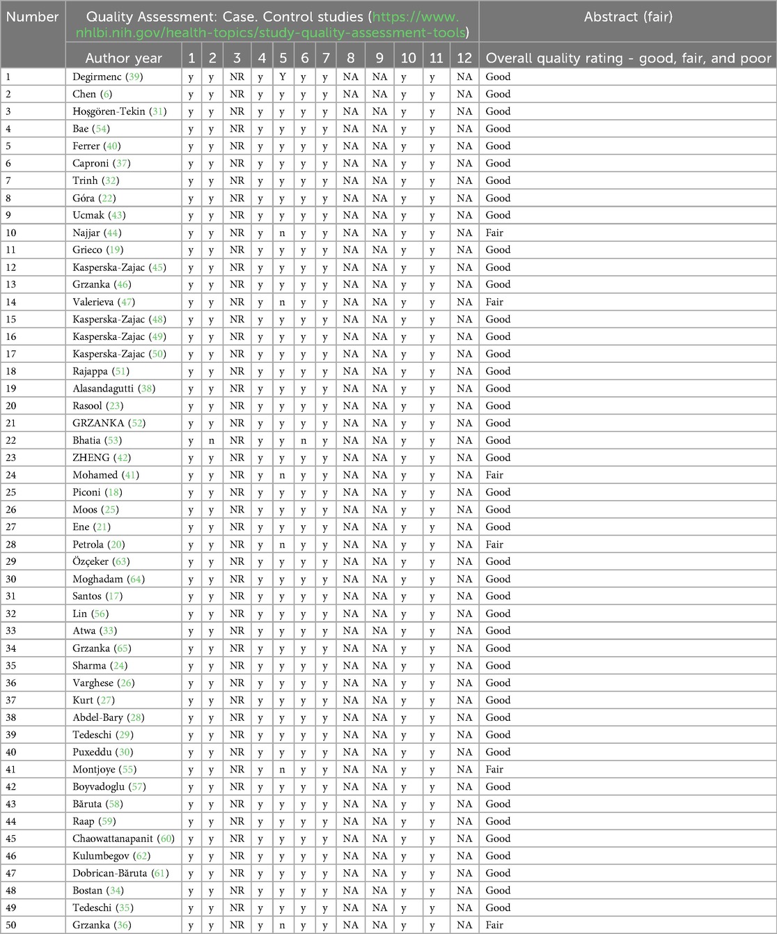 Assessment of study quality using the NHLBI Quality Assessment Tool for Case-Control Studies indicated that 44 of the 50 included studies (88%) were rated as high quality with a low risk of bias, while the remaining 6 studies (12%) were considered to have a moderate risk of bias (Table 4).