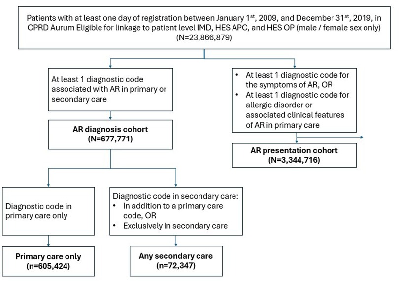 In this retrospective, observational study, patients with an AR record (AR diagnosis), and patients with a record of presenting with AR symptoms but no previous AR diagnosis (AR presentation) were drawn as two cohorts. GP data from the Clinical Practice Research Datalink (CPRD) Aurum database, a UK primary care data source, was used to define the AR presentation cohort, with the AR diagnosis cohort additionally linked to secondary care Hospital Episode Statistics (HES) Admitted Patient Care (APC) and Outpatient (OP) databases (16–18). The source population comprised all research acceptable patients with at least one day of registration between January 1st, 2009, and December 31st, 2019, and who were eligible for linkage to patient level Index of Multiple Deprivation (IMD), HES APC, and HES OP (17–19).