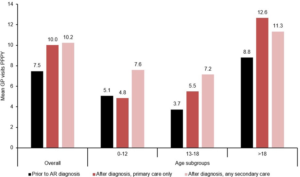 Patients with an AR diagnosis (from any source) visited their GPs more frequently after receiving their diagnosis compared with before, increasing from a mean of 7.5 visits PPPY pre-diagnosis to a mean of 10.0 visits PPPY post-diagnosis, representing a 34% increase (Table 2). The rate of GP visits were similar for patients with a primary care diagnosis only vs. those with an AR record in secondary care (10.0 PPPY and 10.2 PPPY, respectively; Table 2 and Figure 2). However, the increase from pre-diagnosis levels seems to have been driven by adolescent and adult patients; children ≤12 years old who received a primary care diagnosis only reported similar mean GP attendance rates compared to the full pre-diagnosis group (5.1 PPPY prior to diagnosis vs. 4.8 PPPY post-diagnosis, respectively, Table 2 and Figure 2).