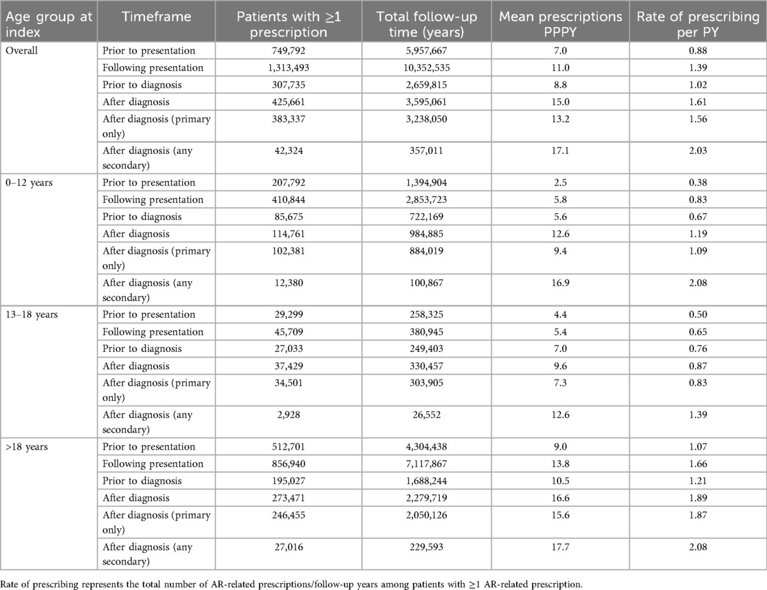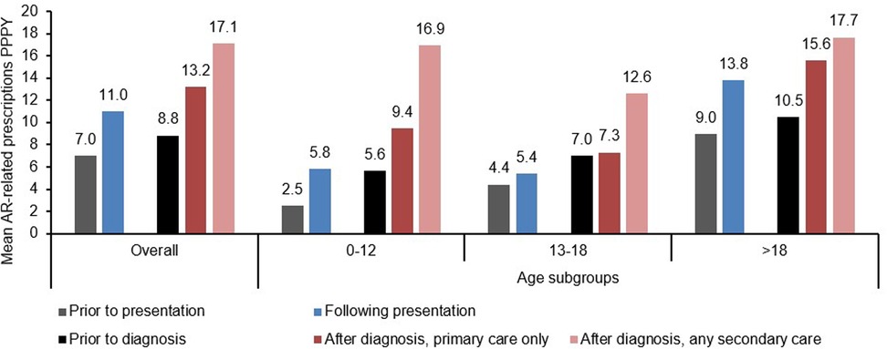 Overall, prescriptions PPPY increased after diagnosis of AR relative to pre-diagnosis levels (Table 3). This pattern was stronger for adults or children compared to adolescents, for whom the mean prescriptions PPPY only increased by 9% post-diagnosis (from 7.0–9.6 PPPY; Table 3). AR patients who received any secondary care diagnosis were given more prescriptions from GPs over the course of their follow-up compared to patients who received a primary care diagnosis only, with a 98% increase from the full group levels in prescription rate after any secondary care diagnosis vs. a 53% increase after primary care diagnosis only. The proportion of patients with ≥1 AR-related prescription from their GP also increased from 45% before diagnosis to 63% after diagnosis (Table 3), and an overall 57% increase in mean prescriptions PPPY was observed comparing individuals before the presentation of AR-related symptoms/conditions vs. afterwards, with increases ranging from a 23% increase for adolescent patients to a 132% increase for pediatric patients (Figure 3). Comparing patients in the primary care only group vs. the any secondary care group, the proportion of patients receiving ≥1 AR-related prescription after diagnosis was comparable (63% and 59%, respectively; Table 3). However, the total rate of prescriptions (total prescriptions among patients with ≥1 AR-related prescription per 100,000 PYs of their respective follow-up) was 30% higher for the any secondary care group vs. the primary care only group, with this increase varying substantially across age groups from 11% for adults to 90% for pediatric patients (Table 3).