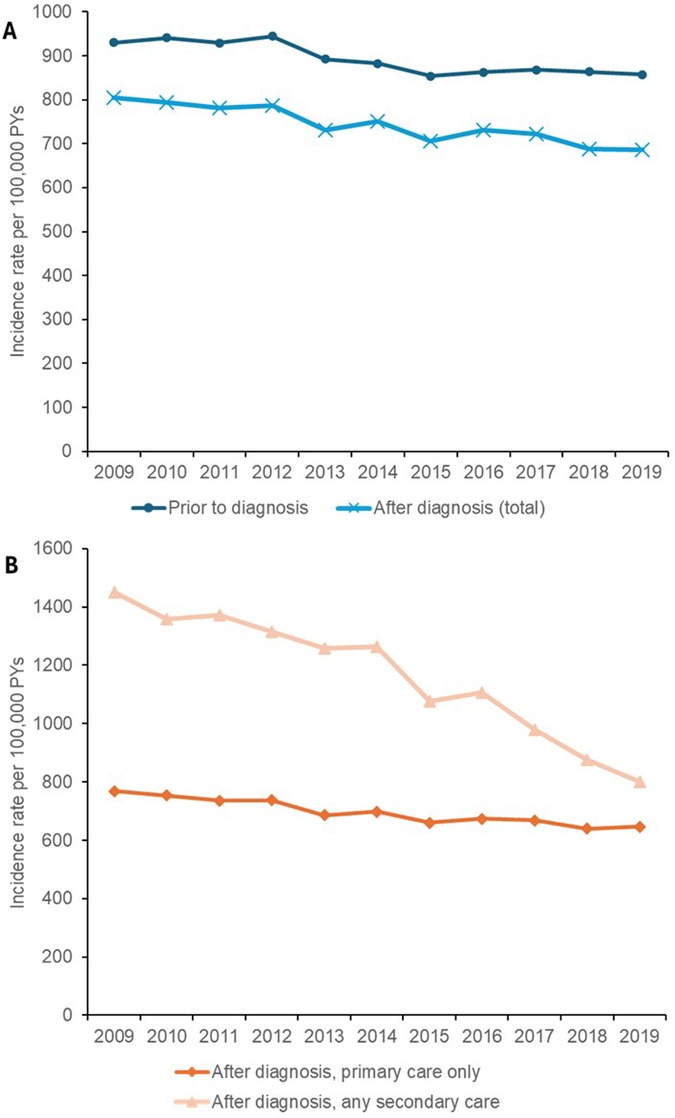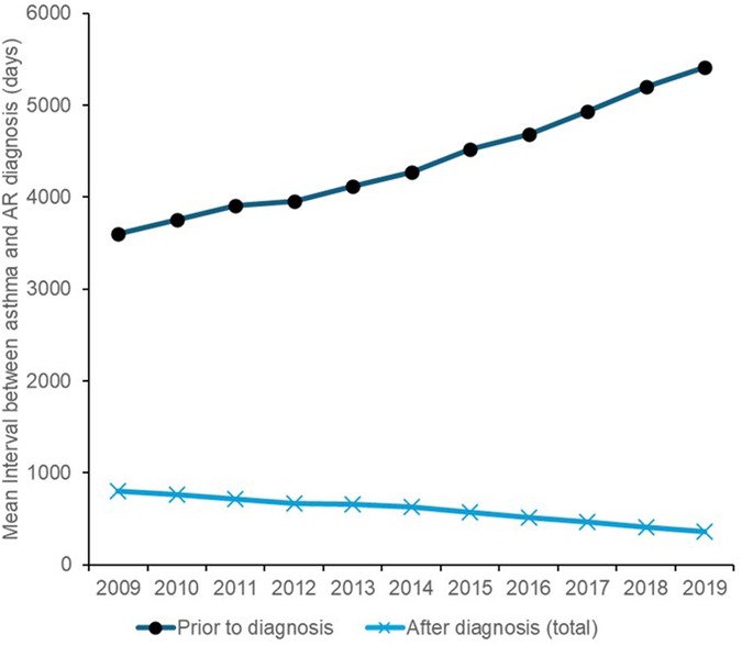 Across the full study follow-up period, the incidence rate of asthma was lower after AR diagnosis compared to before, dropping from a mean rate of 895 new patients per 100,000 PYs pre-diagnosis to 747 new patients per 100,000 PYs post-diagnosis. The annual incidence rate of asthma in patients with AR remained stable from 2009–2019 for patients prior to diagnosis (Figure 4A) or among those who only received a diagnosis in primary care, but this rate considerably declined over time in patients who received any secondary care diagnosis of AR, dropping from 1,450 new cases per 100,000 PYs in 2009–800 new cases per 100,000 PYs in 2019 (Figure 4B). The mean interval between the index dates of asthma and AR was also substantially shorter for patients who already had an AR diagnosis (559 days or 1.5 years) compared to those who were not yet diagnosed (4,333 days or 11.9 years), with the mean duration increasing over time from 2009–2019 for the pre-AR diagnosis group compared to the post-AR diagnosis group (Figure 5) which decreased over time. Post-AR diagnosis, the interval between the onset of asthma and AR diagnosis was also noted to be an average of 162 days shorter for patients in the any secondary care group (mean interval of 478 days) compared to those in the primary care only group (mean interval of 640 days).